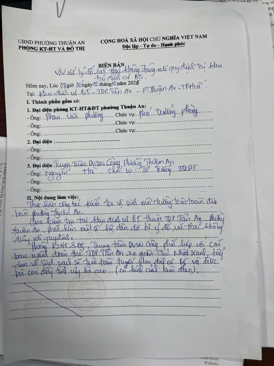 Sau khi nhận được phản ánh, UBND phường Thuận An đã chỉ đạo Phòng Kinh tế, Hạ tầng và Đô thị phường phối hợp với Trung tâm dịch vụ sự nghiệp công phường kiểm tra thực tế hiện trường và phối hợp với các ban ngành, đoàn thể Tổ dân phố Tân An ra quân Ngày Chủ Nhật xanh tiến hành tổng dọn vệ sinh sạch sẽ tại ví trí phản ánh nói trên. (Đính kèm biên bản làm việc và hình ảnh)