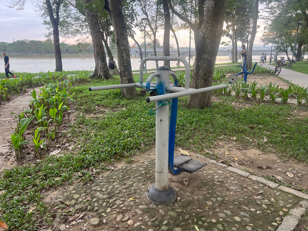 Dụng cụ tập thể dục công viên bờ Bắc sông Hương, phía gần cầu Dã Viên hư hỏng rất nhiều lần, đơn vị sửa chữa không triệt để, chất lượng kém, hỏng ngay. Đề nghị cơ quan chức năng thay thế loại tốt. Ảnh chụp lúc 16h40 ngày 7/12/2025.