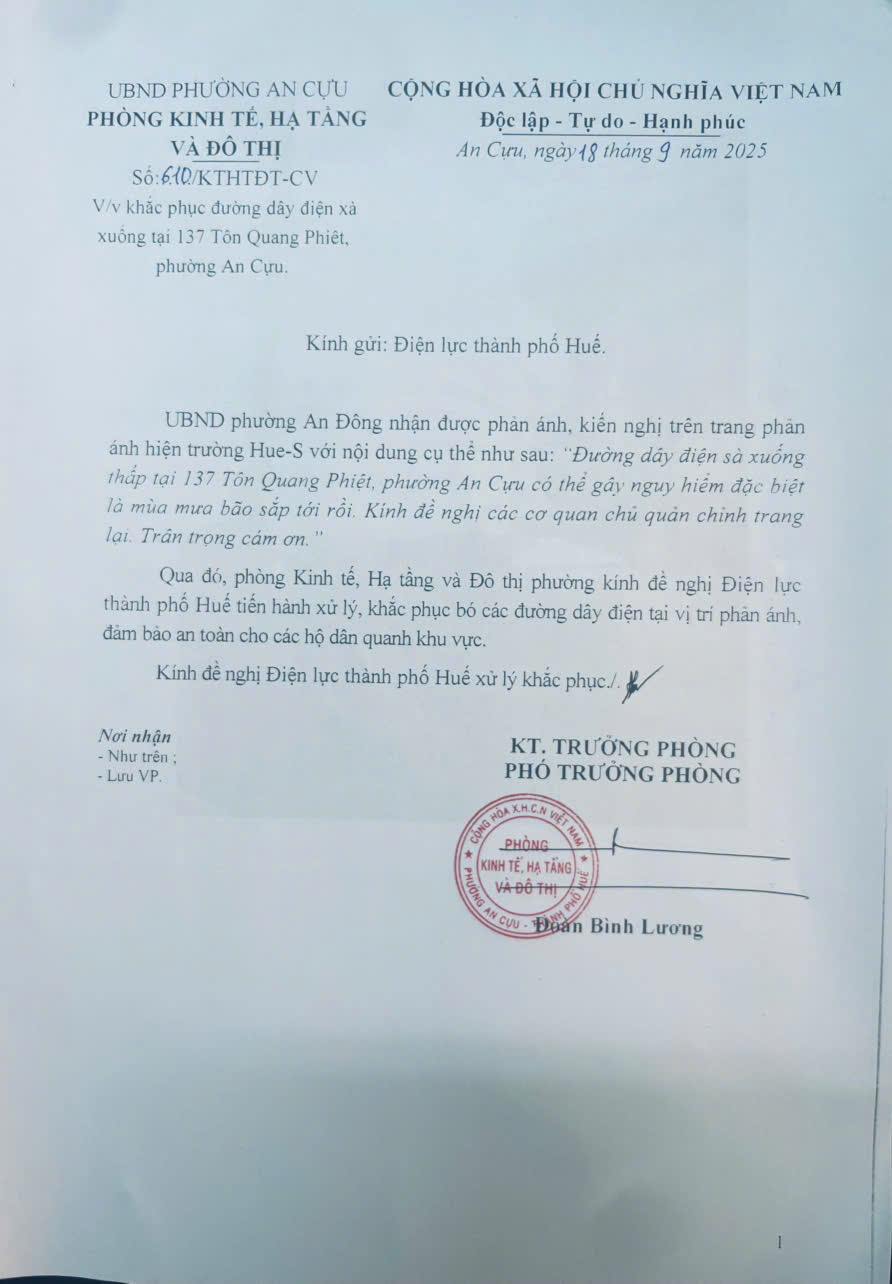 Phòng Kinh tế, Hạ tầng và Đô thị phường đã ban hành Công văn số 610/KTHTĐT-CV ngày 18/9/2025 đến Điện lực thành phố Huế để đề nghị khắc phục bó đường dây điện đảm bảo an toàn quanh khu vực.