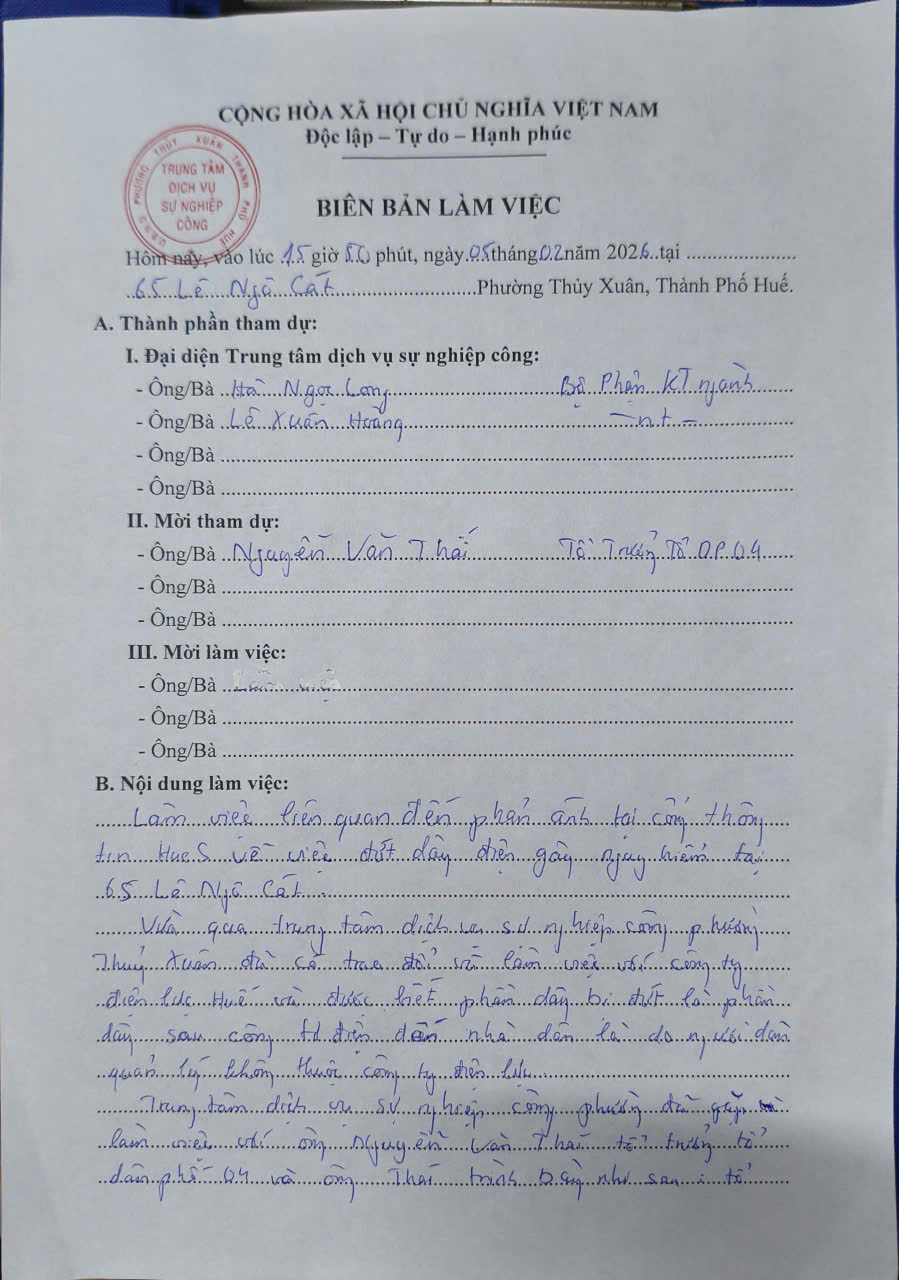 Trung tâm Dịch vụ sự nghiệp công phường Thuỷ Xuân đã làm việc với Tổ trưởng Tổ dân phố 04 được biết: Đồng chí Tổ trưởng đã làm việc với ông T.V.H chủ đường dây diện bị đứt và yêu cầu ông H khắc phục tránh ảnh hưởng đến người dân và giao thông (đính kèm biên bản làm việc).