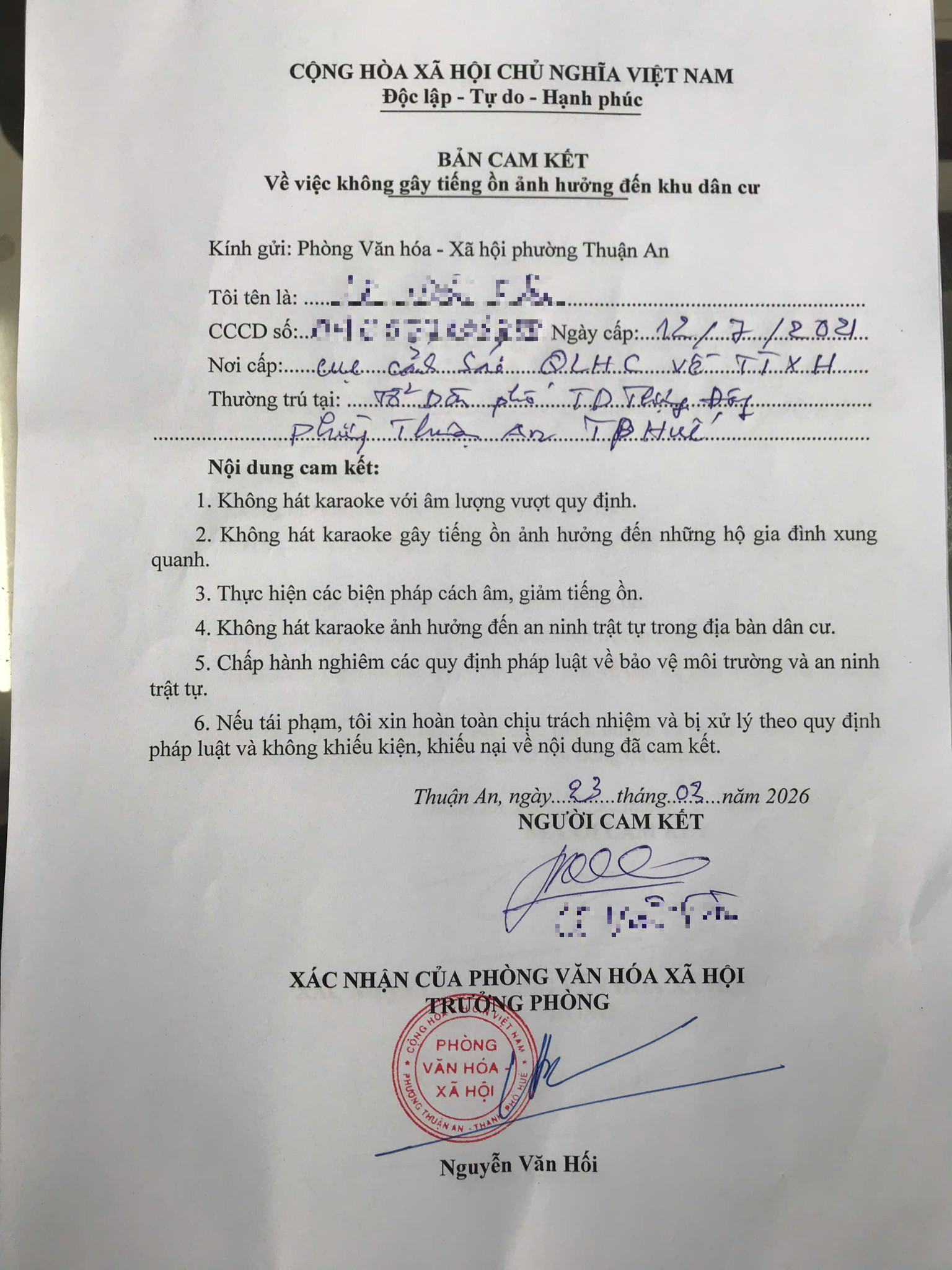 Qua buổi làm việc, hộ gia đình đã thừa nhận hành vi vi phạm và nghiêm túc tiếp thu ý kiến, đồng thời đã ký bản cam kết không tiếp tục gây tiếng ồn ảnh hưởng đến khu dân cư.