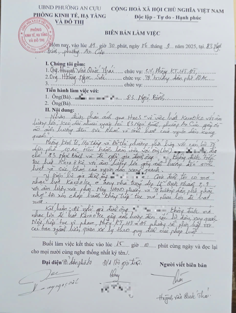 UBND phường đã chỉ đạo Phòng Kinh tế, Hạ tầng và Đô thị phường phối hợp với Tổ trưởng dân phố 10AC làm việc với hộ gia đình ông L.V.H. tại 83 Ngự Bình, yêu cầu gia đình ông H không được tiếp tục hát karaoke với âm lương lớn ảnh hưởng đến sinh hoạt và sức khỏe của người dân xung quanh (có biên bản kèm theo).