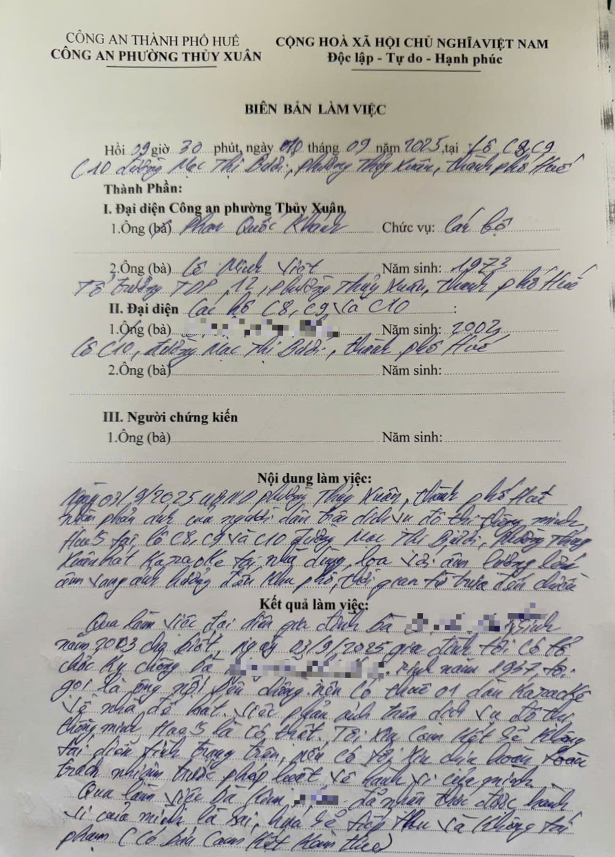 Qua nội dung phản ảnh của Ông/Bà, Cảnh sát khu vực đã đến làm việc với bà L.T.K.T; bà T trao đổi: gia đình có tổ chức kỵ ông nội chồng và có thuê 01 dàn karaoke về để hát và việc phản ánh trên Hue-S là có thật. Bà T xin cam đoan cam kết sẽ không tái diễn tình trạng trên. Qua buổi làm việc, bà T nhận thức được hành vi của mình là sai, hứa sẽ tiếp thu và không tái phạm.