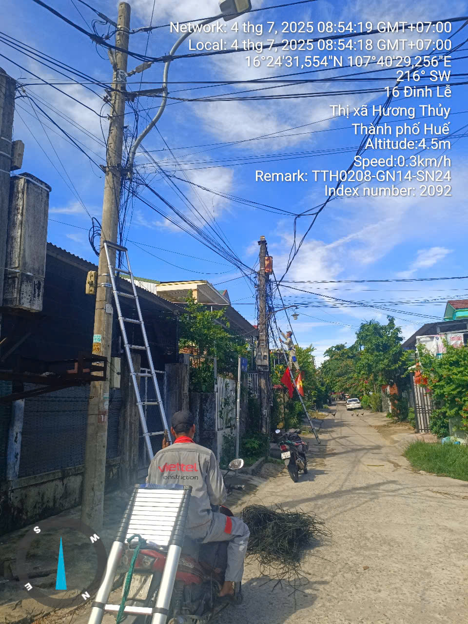 Hệ thống dây điện thắp sáng và dây mạng chằng chịt, dây không sử dụng cắt, cột lung tung. Đề nghị xử lí gọn gàng lại, tại trước số nhà 25A đường Đinh Lễ, phường Phú Bài, thành phố Huế. Ảnh và video chụp vào sáng ngày 03/7/2025