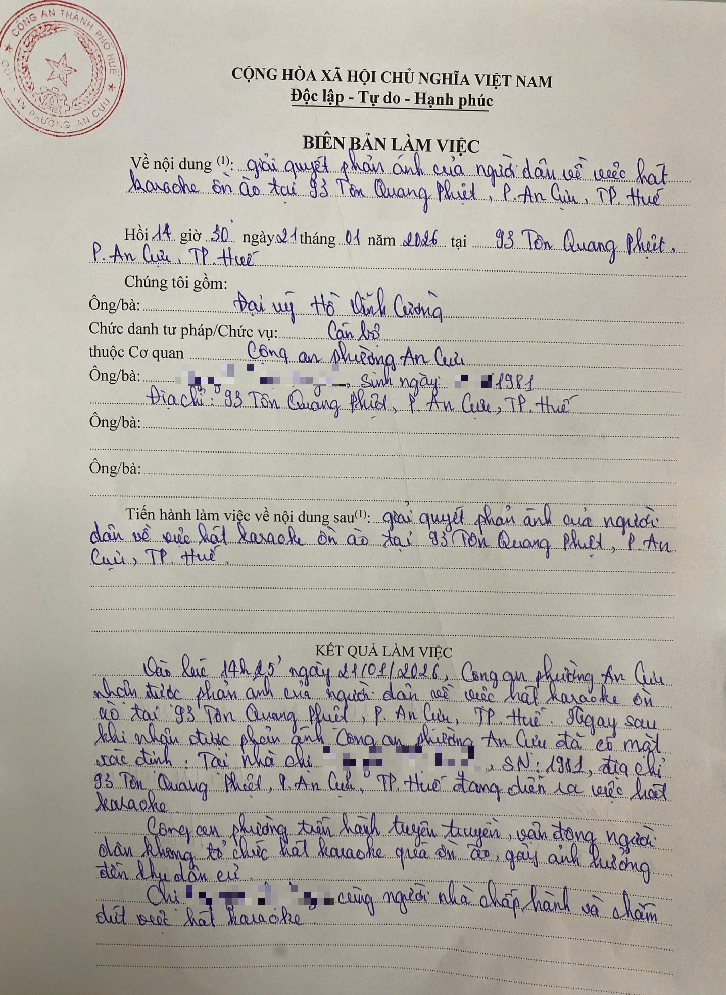 Công an phường An Cựu đã lập biên bản nhắc nhở đối với hộ gia đình tại 93 Tôn Quang Phiệt (Có biên bản kèm theo).