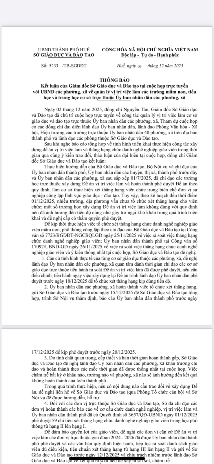 Tôi là nhân viên trường học đang công tác trên địa bàn thành phố Huế. Xin hỏi Sở Giáo Dục và Đào tạo Thành phố Huế theo TB số 5233/TB-SGDĐT ngày 3/12/2025 thì đợt này đội ngũ nhân viên trường học có được làm hồ sơ xét thăng hạng và chuyển hạng theo đề án vị trí việc làm của đơn vị không?