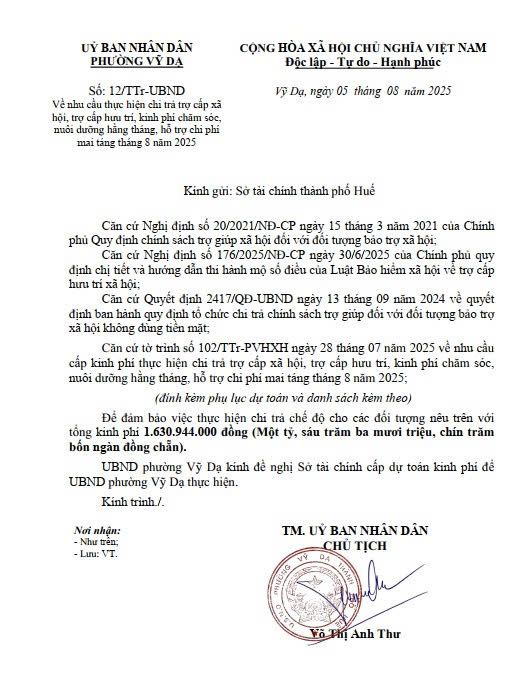 Căn cứ Nghị định số 20/2021/NĐ-CP ngày 15 tháng 3 năm 2021 của Chính phủ Quy định chính sách trợ giúp xã hội đối với đối tượng bảo trợ xã hội; Căn cứ Nghị định số 147/2025/NĐ-CP ngày 12 tháng 6 năm 2025 của Chính phủ quy định về phân định thẩm quyền của chính quyền địa phương 02 cấp trong lĩnh vực quản lý nhà nước của Bộ Y tế; Căn cứ Nghị định số 176/2025/NĐ-CP ngày 30/6/2025 của Chính phủ quy định chi tiết và hướng dẫn thi hành một số điều của Luật Bảo hiểm xã hội về trợ cấp hưu trí xã hội; UBND phường Vỹ Dạ đã thực hiện theo đúng quy định đã ra quyết định trợ cấp hưu trí xã hội cho Người cao tuổi đủ 75 tuổi trở lên không có lương hưu, trợ cấp bảo hiểm xã hội hàng tháng; đồng thời UBND phường đã lập tờ trình số: 12/TTr –UBND ngày 05 tháng 8 năm 2028 (đính kèm) gửi Sở Tài chính thành phố Huế về nhu cầu thực hiện chi trả trợ cấp xã hội, trợ cấp hưu trí, kinh phí chăm sóc, nuôi dưỡng hằng tháng, hỗ trợ mai táng phí tháng 8 năm 2025.