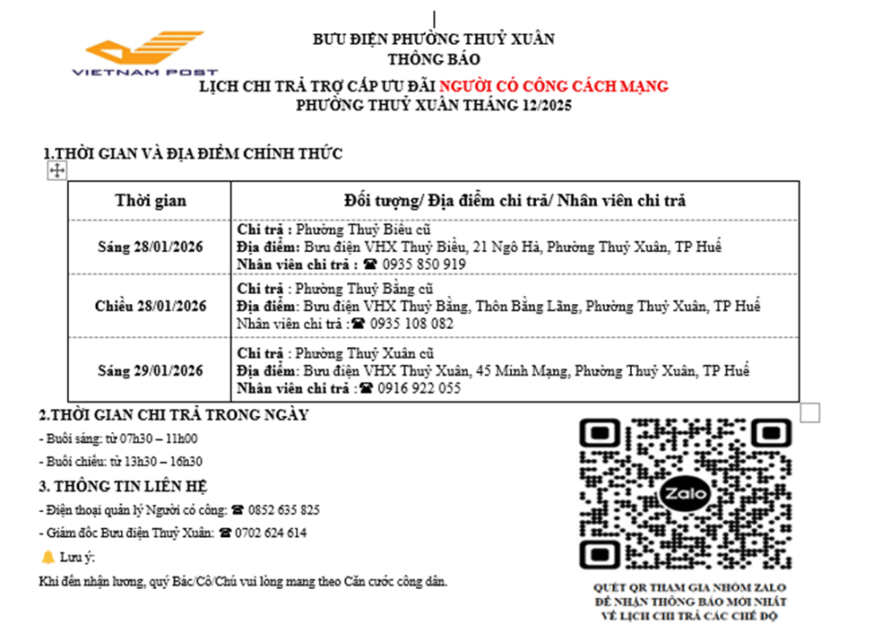 Lịch chi trả trợ cấp ưu đãi người có công cách mạng và bảo trợ xã hội phường Thuỷ Xuân tháng 12/2025; tháng 01-02/2026 được thực hiện (theo thông báo đính kèm).