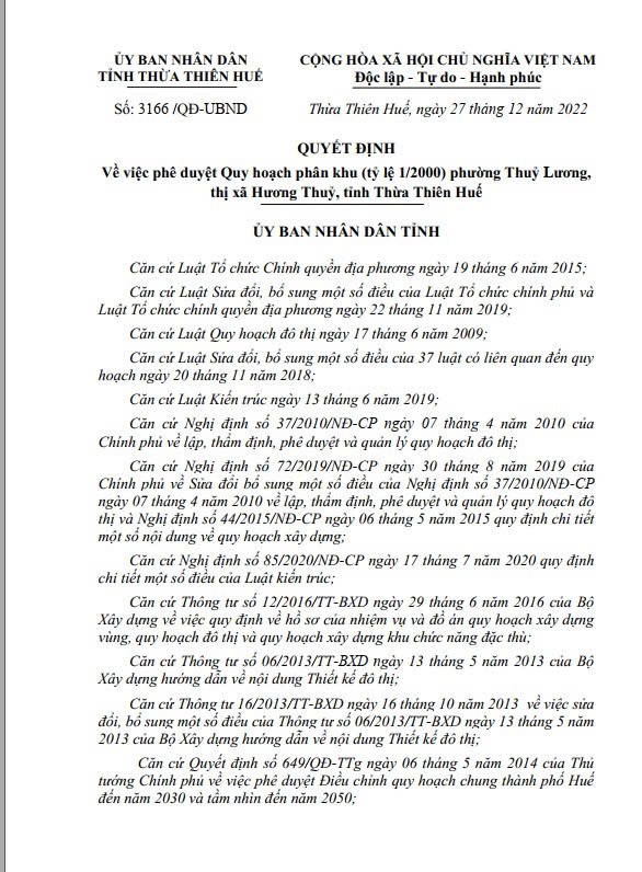 Quyết định số 3166/QĐ-UBND về việc phê duyệt Quy hoạch phân khu (tỷ lệ 1/2000) phường Thuỷ Lương, thị xã Hương Thuỷ, tỉnh Thừa Thiên Huế hiện nay còn hiệu lực và áp dụng.