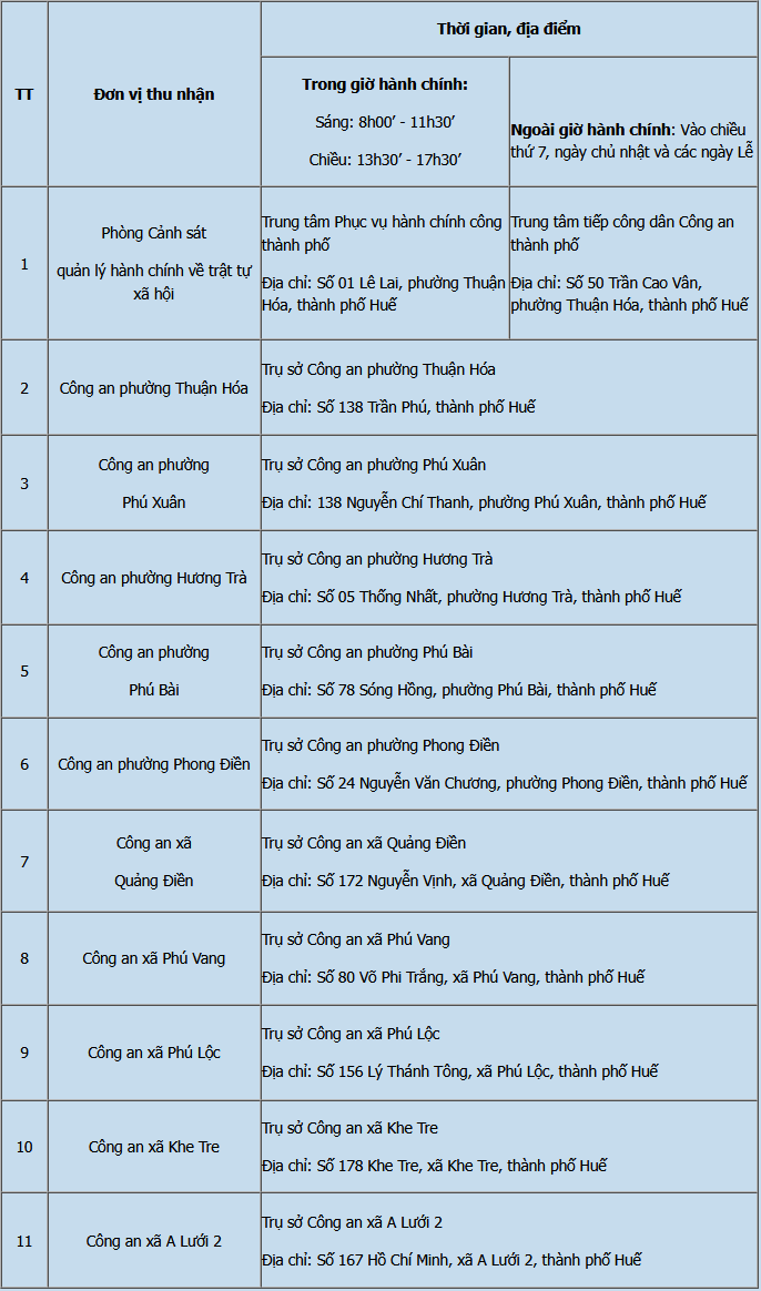 Sau khi triển khai mô hình chính quyền địa phương 02 cấp, Công an thành phố đã bố trí 11 địa điểm thu nhận hồ sơ cấp thẻ căn cước cho công dân cư trú trên địa bàn thành phố Huế. Trường hợp công dân có nhu cầu cấp thẻ căn cước thì đến các địa điểm trên để làm thủ tục, cụ thể như sau: (Đính kèm hình ảnh)