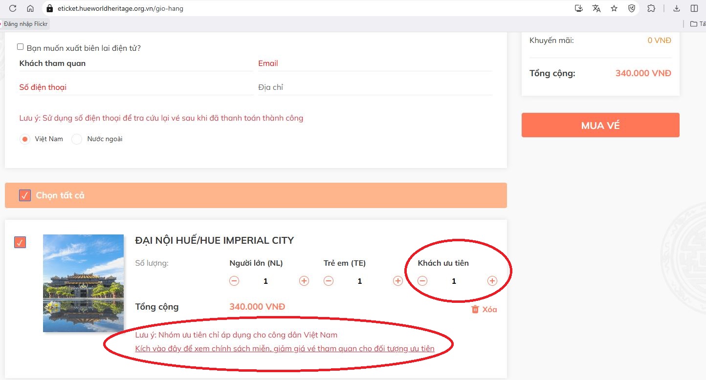 Trong trường hợp này để mua vé đúng quyền lợi, quý du khách cần đặt: 01 vé người lớn, 01 vé trẻ em và 01 vé ưu tiên. Khi đó, tổng số tiền thanh toán chỉ là 340.000 đồng. Ở bước thanh toán cuối cùng, hệ thống sẽ yêu cầu điền thông tin và tải giấy tờ chứng minh là công dân thành phố Huế lên hệ thống để kết thúc thanh toán.