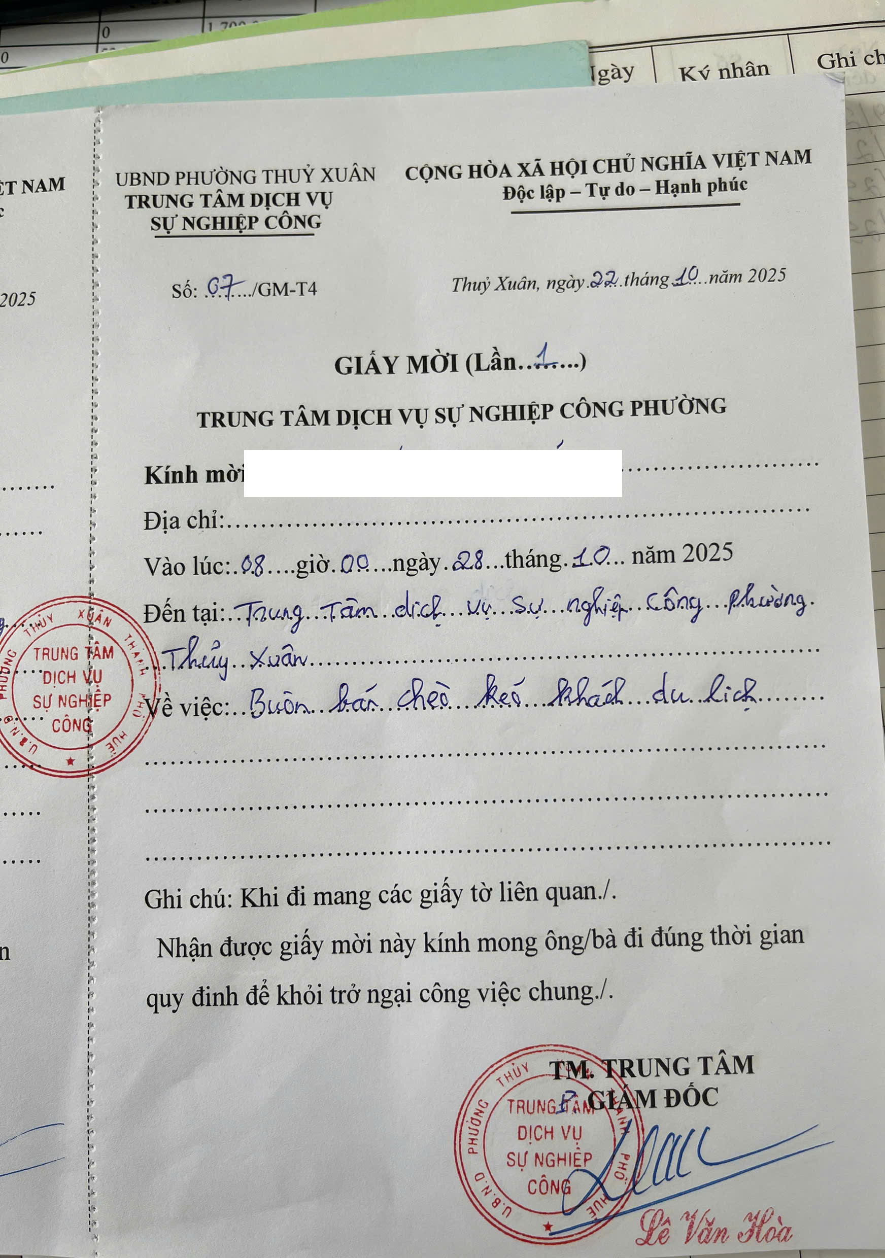 Trung tâm Dịch vụ sự nghiệp công phường Thuỷ Xuân đã phối hợp với Công an phường tiến hành kiểm tra thực tế. Tại thời điểm kiểm tra, Trung tâm đã làm việc và gửi giấy mời bà N.T.N làm việc liên quan đến việc buôn bán chèo kéo khách du lịch. (Giấy mời và hình ảnh đính kèm)