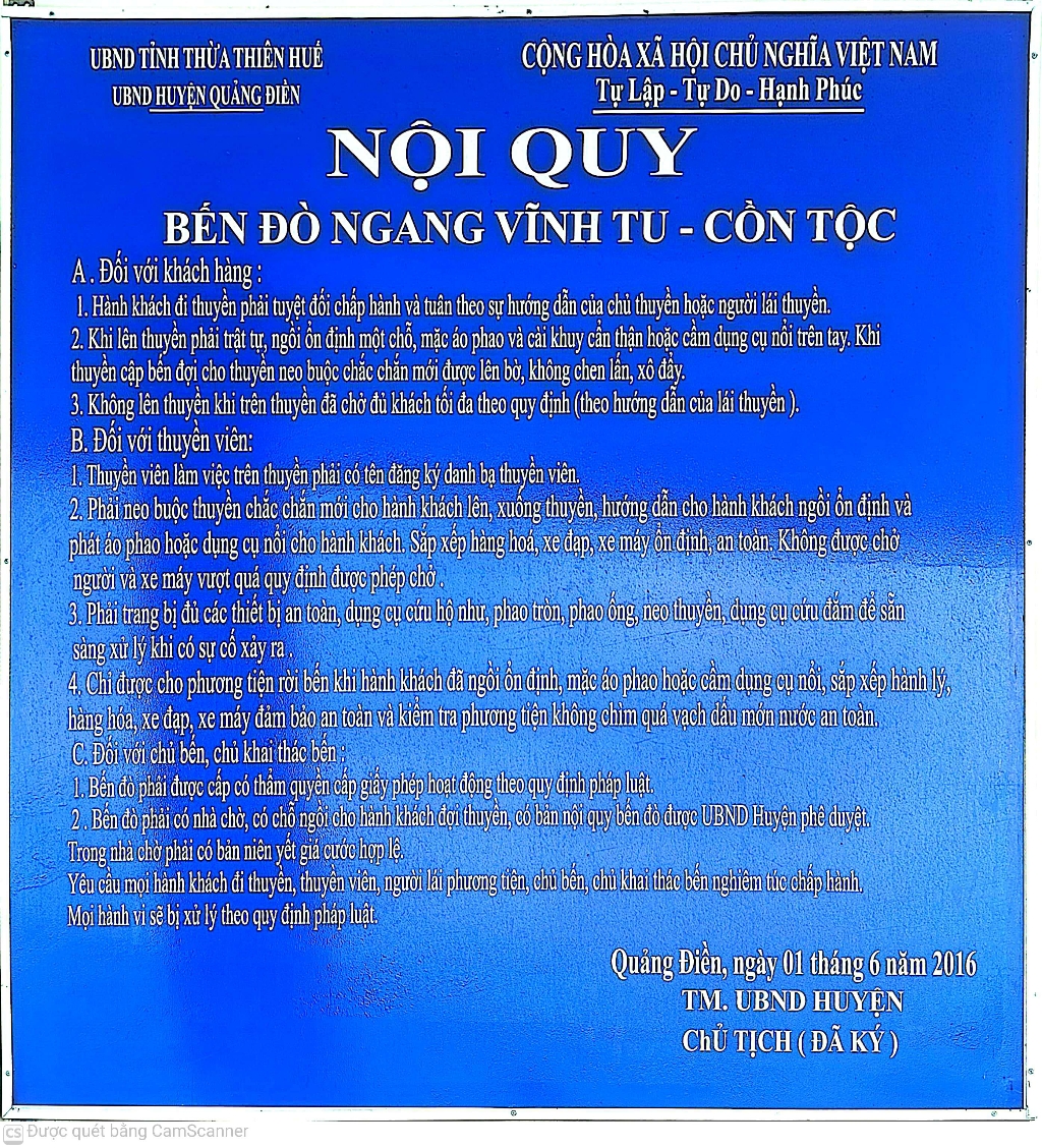 Trung tâm Dịch vụ sự nghiệp công phường đã tiến hành tháo dỡ các bảng nội quy nói trên, không treo tại nơi công cộng, tuy nhiên do chưa kịp thời thu hồi nên vẫn còn dựng tại khu vực nhà chờ bến đò Vĩnh Tu. Sau khi tiếp nhận phản ánh, kiến nghị của công dân trên Hue-S, Trung tâm đã khẩn trương tiến hành thu hồi toàn bộ bảng nội quy không phù hợp tại nhà chờ bến đò Vĩnh Tu. Trong thời gian tới, Trung tâm sẽ xây dựng, chỉnh sửa và niêm yết lại các bảng nội quy, quy định hoạt động bến đò theo đúng quy định hiện hành, đảm bảo phù hợp với tình hình thực tế và công tác quản lý sau sáp nhập chính quyền địa phương 2 cấp.