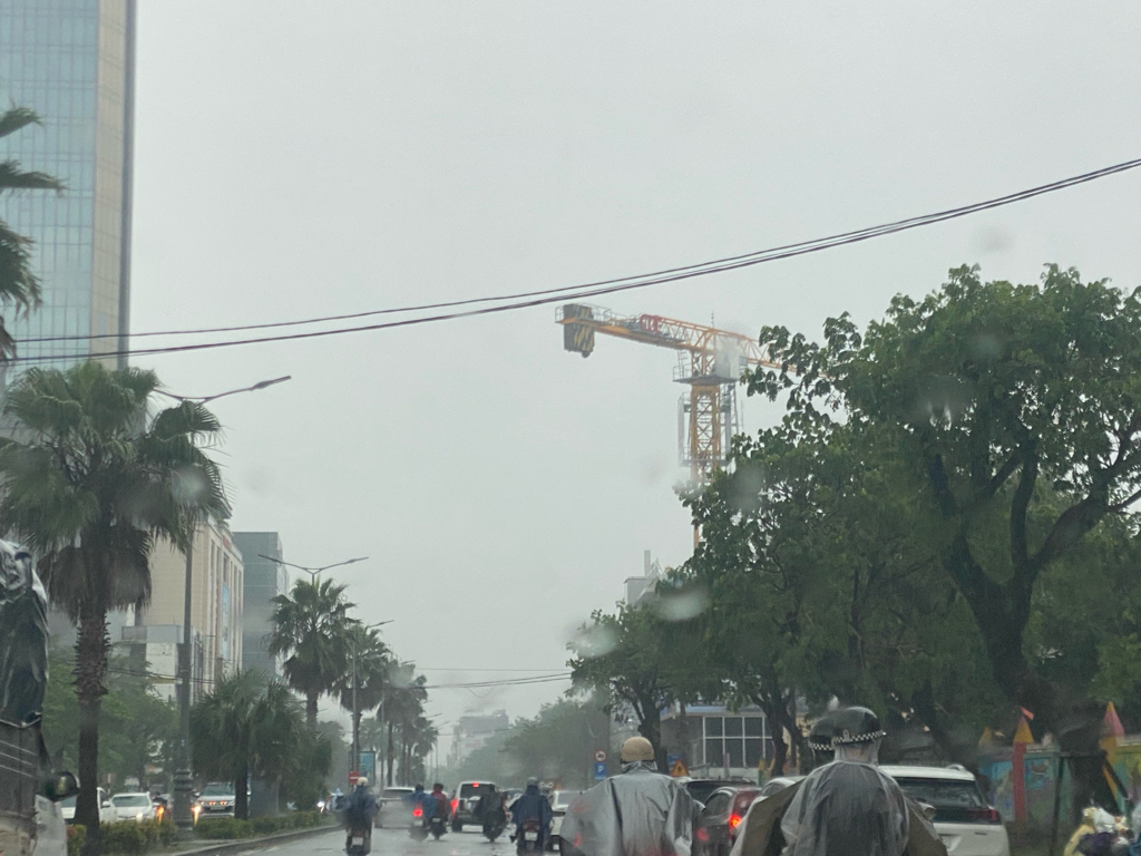 Tại công trường tòa nhà Hue Heritage đường Đống Đa. Cần trục có phần đối trọng (bê tông) vươn ra khỏi phạm vi xây dựng, lơ lửng trên phần đường giao thông bên dưới. Rất nguy hiểm, cần kiểm tra có vi phạm quy định an toàn không. Xin cám ơn.