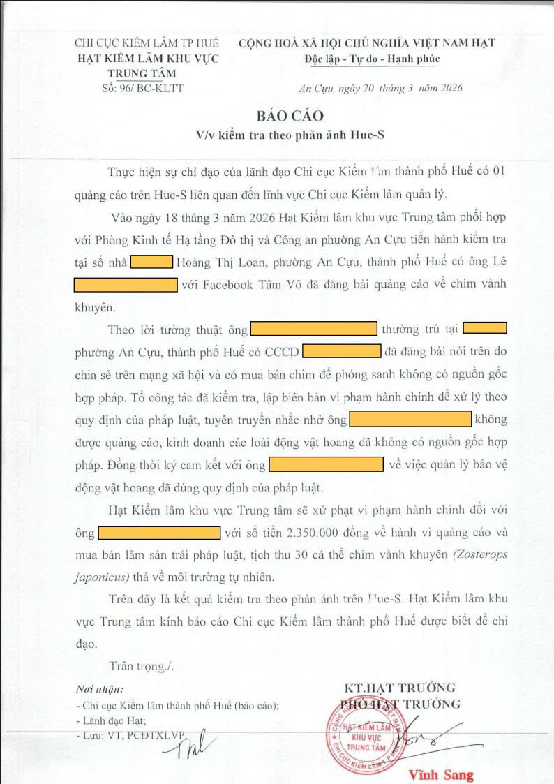 Vào ngày 18/3/2026, Hạt Kiểm lâm khu vực Trung tâm phối hợp với Phòng Kinh tế, Hạ tầng và Đô thị cùng Công an phường An Cựu tiến hành kiểm tra tại địa bàn phường An Cựu, thành phố Huế đối với ông L.P.H.L (tài khoản Facebook T.V.) có đăng bài quảng cáo về chim vành khuyên.