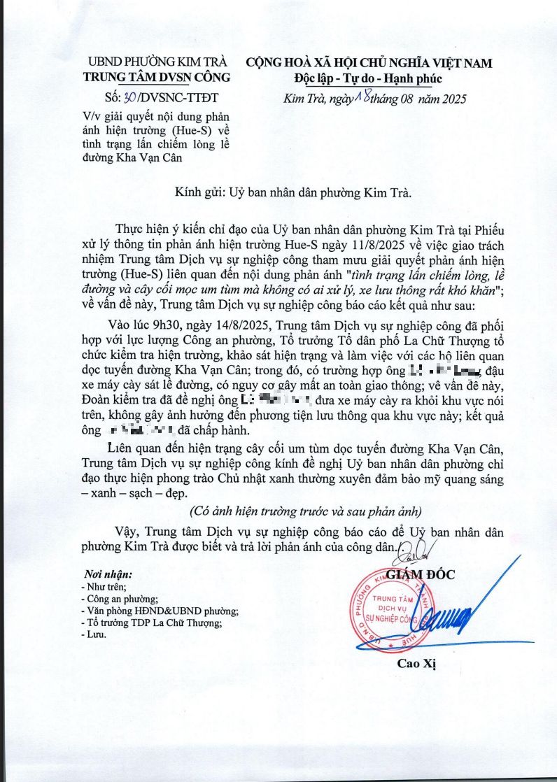 Vấn đề quý Ông/Bà phản ánh, UBND phường Kim Trà xin thông báo kết quả như sau: