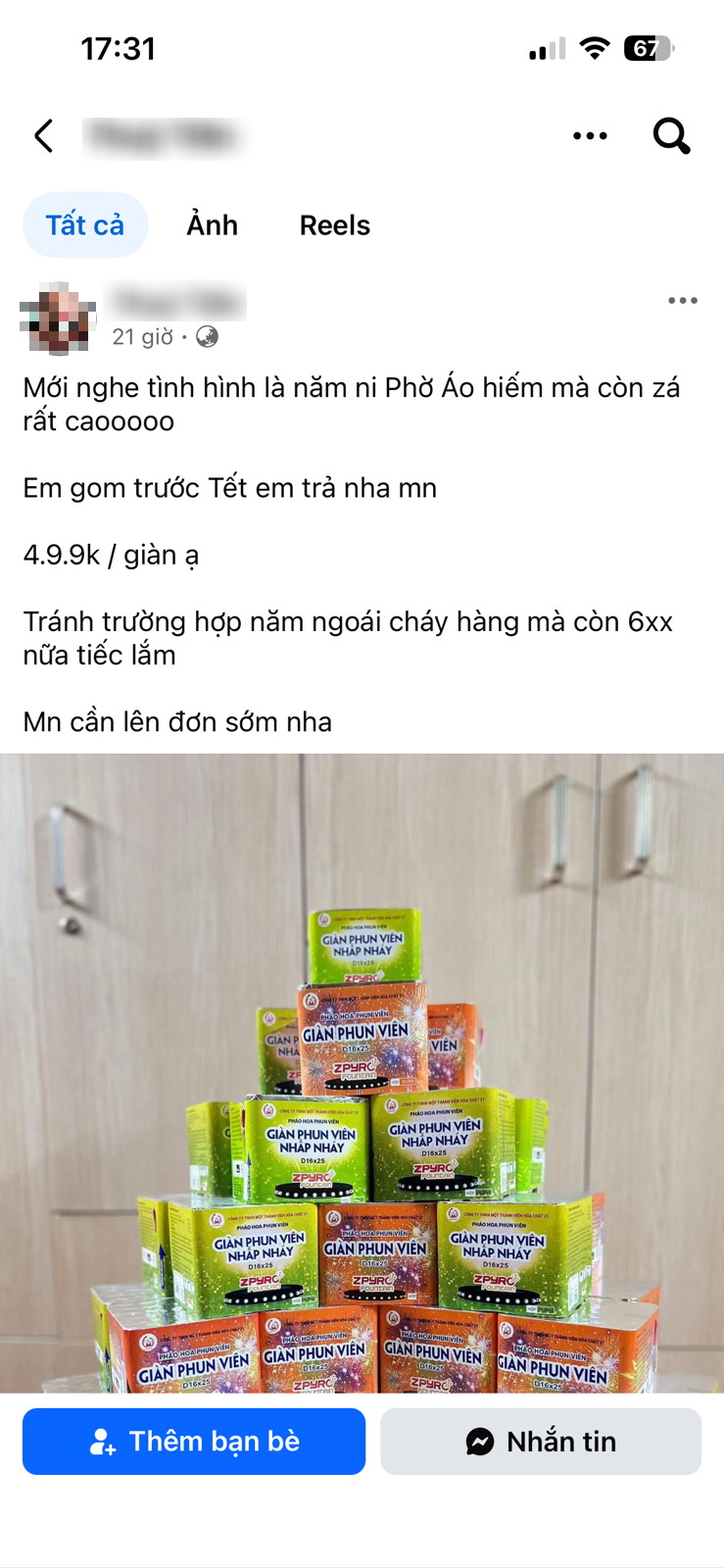 Bà T cho biết việc đăng bài nhằm giới thiệu giúp cửa hàng pháo số 3, địa chỉ số 54 Nguyễn Văn Thương, phường Phú Bài, thành phố Huế; bản thân không trực tiếp kinh doanh, không tàng trữ pháo hoa và không thực hiện việc mua bán pháo hoa cho bất kỳ trường hợp nào. Trong thời gian bài viết tồn tại trên mạng xã hội, không phát sinh bình luận hay giao dịch mua bán.