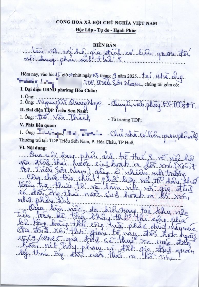 Ngày 29/8/2025, UBND phường Hoá Châu đã nhận được phản ánh kiểm tra xả thải gây ô nhiễm tại xóm 7, TDP Triều Sơn Nam (Lần 2) và đã chỉ đạo Phòng Kinh tế-Hạ tầng và Đô thị phân công chuyên viên phụ trách lĩnh vực phối hợp với Tổ dân phố Triều Sơn Nam tiến hành kiểm tra thực tế tại địa bàn và làm việc với gia đình. Qua quá trình làm việc gia đình đã cam kết đến ngày 15/9/2025 sẽ xử lý xong vấn đề xả thải gây ô nhiễm môi trường nói trên. (Đính kèm biên bản làm việc)