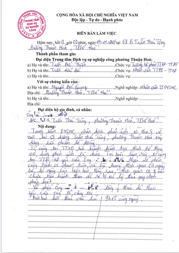 Sau khi tiếp nhận phản ánh về việc xây dựng lấn chiếm lề đường tại địa chỉ 58 Trần Thái Tông, phường Thuận Hóa. Trung tâm Dịch vụ sự nghiệp công phường Thuận Hoá đã chỉ đạo Bộ phận Trật tự Xây dựng và Trật tự đô thị tiến hành kiểm tra thực tế. Qua kiểm tra, ghi nhận tại vị trí nêu trên có dấu hiệu lấn chiếm lề đường. Lực lượng chức năng đã lập biên bản nhắc nhở chủ hộ, yêu cầu tự tháo dỡ phần vi phạm, đồng thời cam kết không tái lấn chiếm.