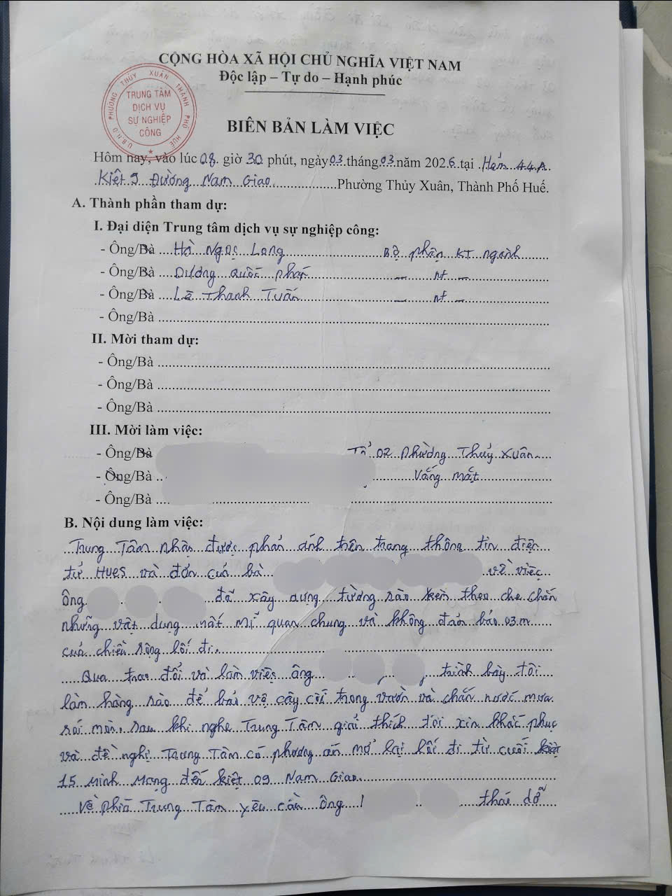 Sau khi nhận được phẩn ánh về việc xây dựng lấn chiếm tại cuối hẻm 12, kiệt 15 đường Minh Mạng, phường Thuỷ Xuân, thành phố Huế. Sau khi tiếp nhận thông tin, UBND phường Thuỷ Xuân đã chỉ đạo Trung tâm Dịch vụ sự nghiệp công phường Thuỷ Xuân tiến hành kiểm tra thực tế.