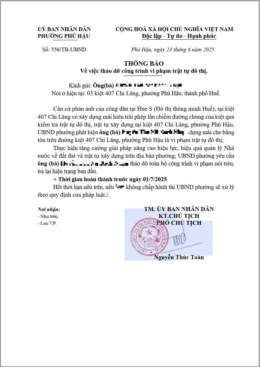 Sau khi nhận được phản ánh, UBND phường đã chỉ đạo Công chức Địa chính - Xây dựng tiến hành kiểm tra tại kiệt 407 Chi Lăng, có 03 trường hợp vi phạm trật tự đô thị, tiến hành gửi Thông báo yêu cầu tháo dỡ toàn bộ công trình vi phạm trước ngày 01/7/2025.