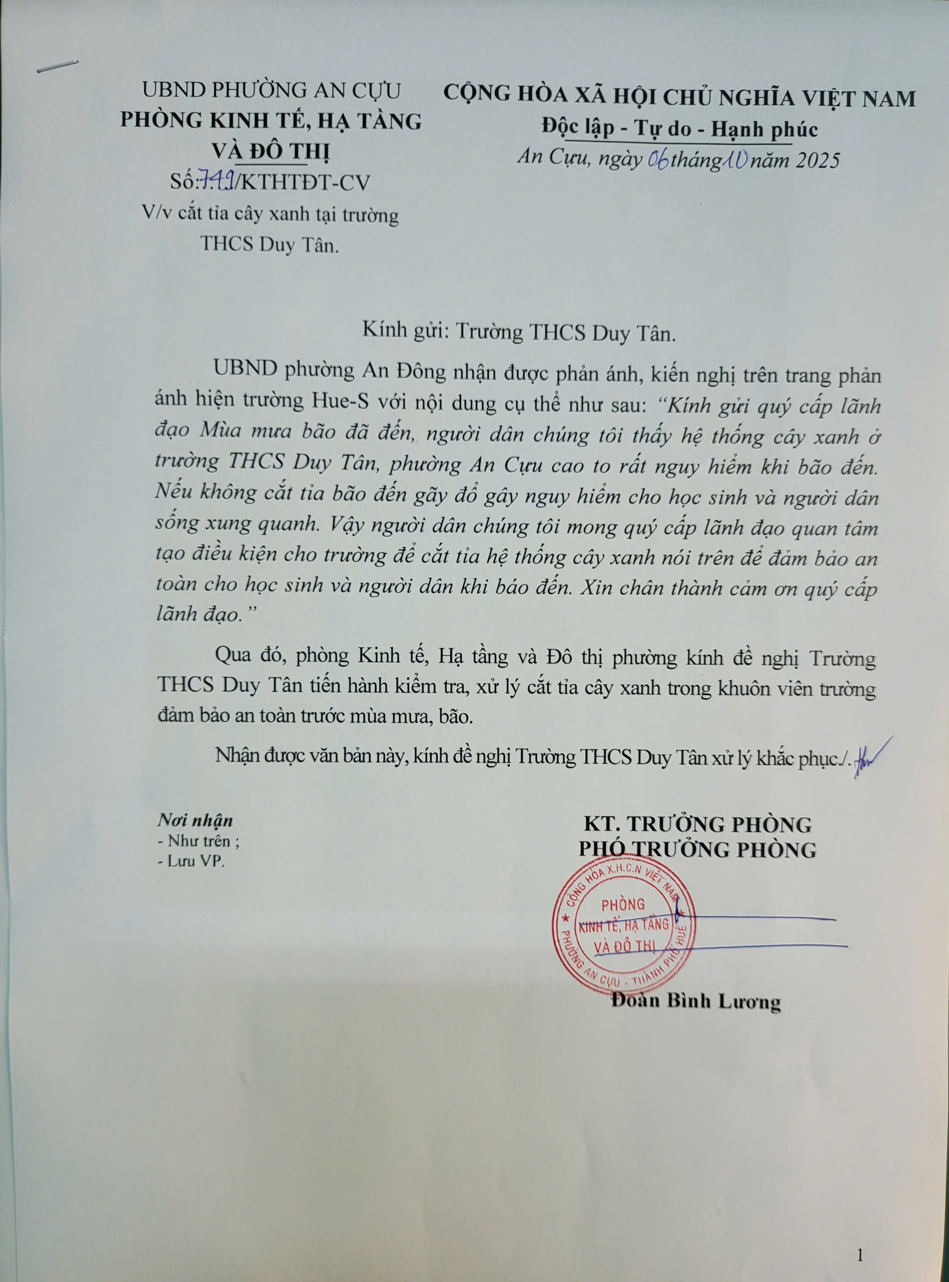 Phòng Kinh tế, hạ tầng và Đô thị phường đã có công văn gửi Trường THCS Duy Tân về việc đề nghị cắt tỉa cây xanh để đảm bảo an toàn trong mùa mưa bão. (Có văn bản kèm theo)
