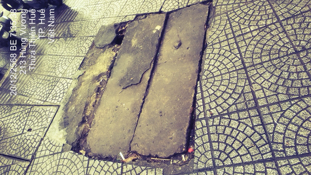Nắp hố ga trước mặt nhà 213 Hùng Vương, An Cựu xuống cấp, rất nguy hiểm cho người đi bộ. Đề nghị thay thế hoặc sửa chửa gấp. Cảm ơn !