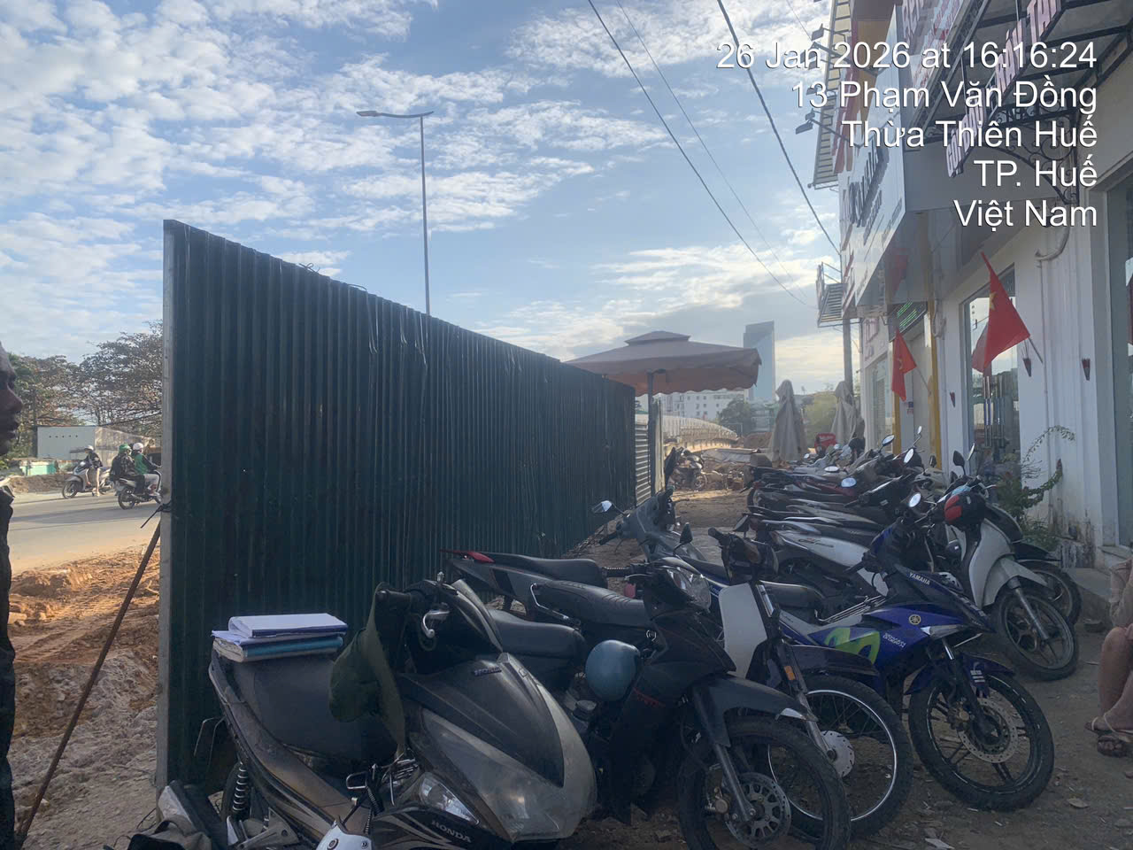Ngày 23/01/2026, đơn vị thi công đã tiến hành lắp dựng hàng rào tôn đoạn từ số nhà 01 đến số nhà 05 đường Phạm Văn Đồng (kèm theo hình ảnh). Tuy nhiên, ngày 27/01/2026, có 04 hộ kinh doanh gửi Đơn cam kết tự nguyện và miễn trừ trách nhiệm, trong đó đề nghị thay thế hàng rào tôn bằng hàng rào cọc và dây phản quang. Ngày 28/01/2026, Ban QLDA phối hợp với đơn vị tư vấn giám sát, đơn vị thi công và 04 hộ kinh doanh đã lập Biên bản xử lý hiện trường, thống nhất thay thế hàng rào tôn bằng hàng rào cọc và dây cảnh báo. Các hộ kinh doanh cam kết chịu trách nhiệm đảm bảo an toàn cho người dân và phương tiện lưu thông trước khu vực kinh doanh. Trường hợp xảy ra sự cố mất an toàn đối với người và phương tiện đi lại trong khu vực vỉa hè đang thi công, các hộ kinh doanh hoàn toàn chịu trách nhiệm (Đính kèm theo Biên bản).