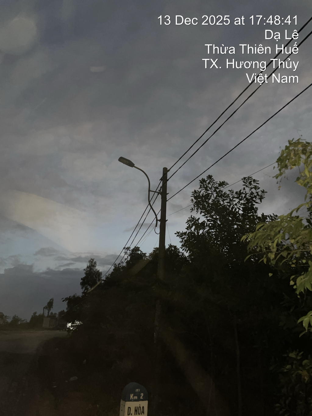 Kiến nghị điều chỉnh giờ cho đèn chiếu sáng tại đường Dạ Lê, phường Thanh Thuỷ, hiện tại giờ chiếu sáng 18h30 nhưng hiện mùa này mưa liên tục tối sớm nên cho đèn đỏ từ 17h30 giống như đoạn ngã 3 Dạ Lê đến Cầu Ông Bang và từ Cầu Ông Bang đến đoạn Công ty bê tông Trường Phú cũ là giờ 18h30 là không chiếu sáng giống nhau nên điều chỉnh giờ đỏ đèn từ 17h 30 là đúng. Vậy kính mong cơ quan chức năng xử lý sớm cho bà con dân nhân đi lại thuận tiện. Hình ảnh đính kèm hiển thị ngày giờ lúc 17h48 phút chiều tối ngày 13 tháng 12 năm 2025. Xin chân thành cám ơn.