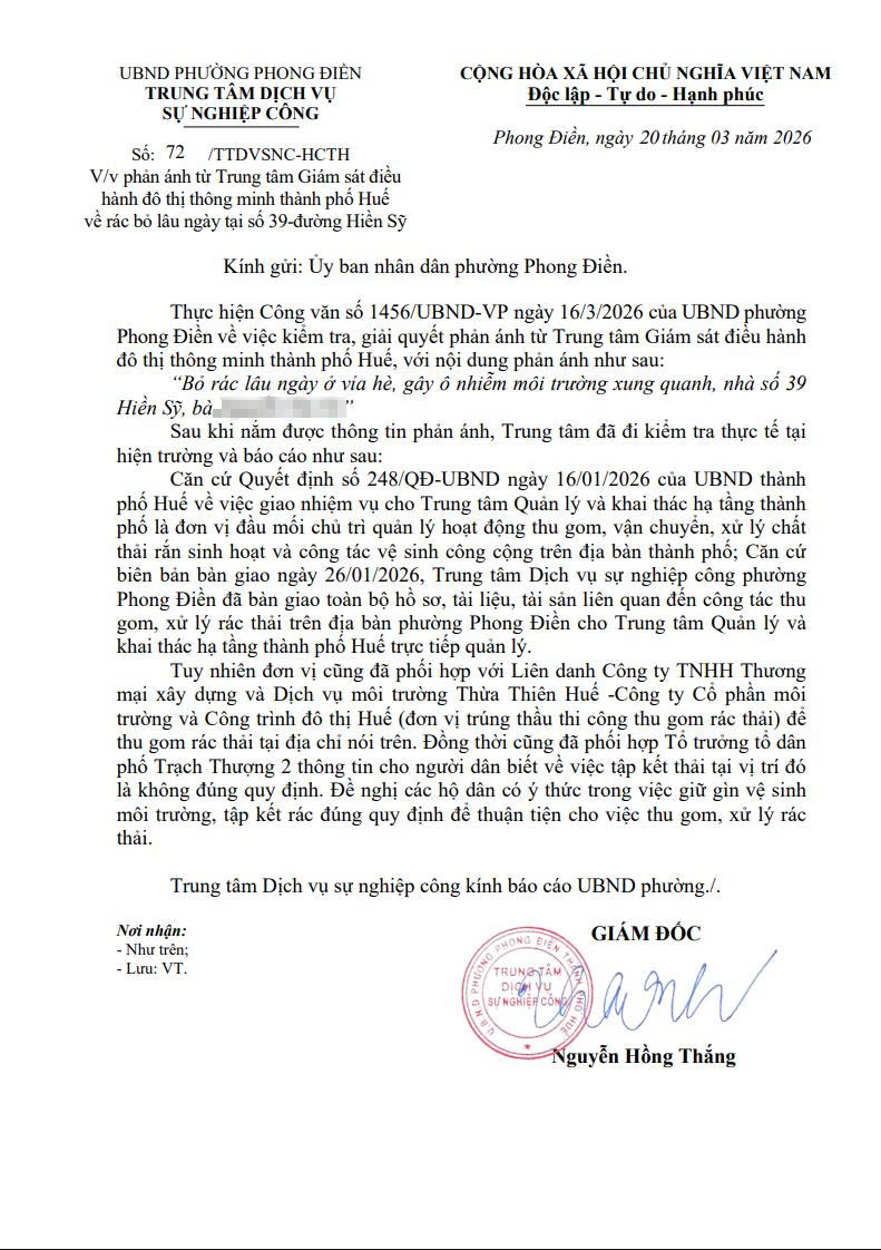 Căn cứ Quyết định số 248/QĐ-UBND ngày 16/01/2026 của UBND thành phố Huế về việc giao Trung tâm Quản lý và Khai thác hạ tầng thành phố là đơn vị đầu mối chủ trì quản lý hoạt động thu gom, vận chuyển, xử lý chất thải rắn sinh hoạt và công tác vệ sinh công cộng trên địa bàn; đồng thời, căn cứ biên bản bàn giao ngày 26/01/2026, Trung tâm Dịch vụ sự nghiệp công phường Phong Điền đã bàn giao toàn bộ hồ sơ, tài liệu và tài sản liên quan đến công tác thu gom, xử lý rác thải trên địa bàn phường cho Trung tâm Quản lý và Khai thác hạ tầng thành phố Huế trực tiếp quản lý.