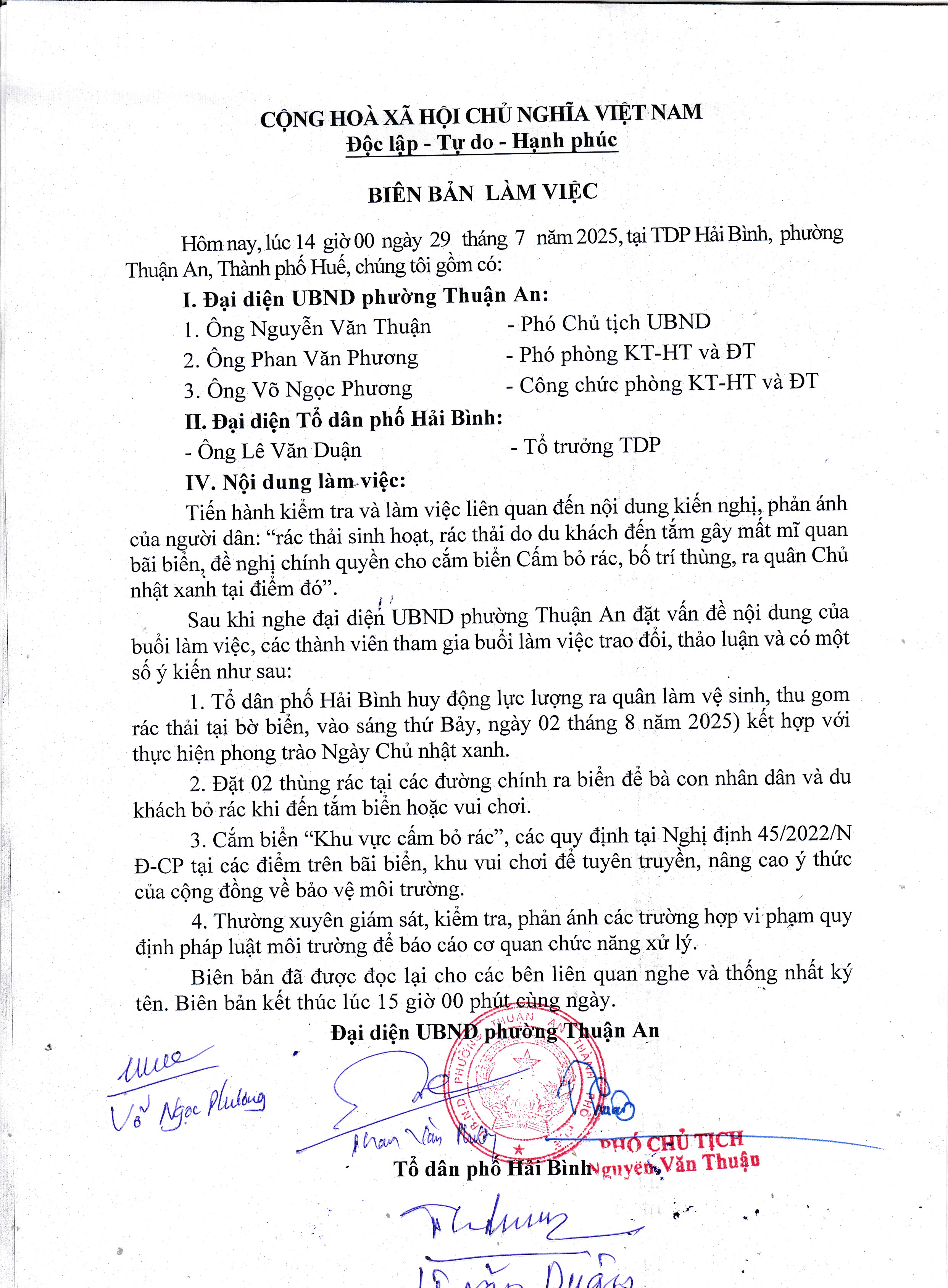 Vào ngày 29/7/2025, UBND phường đã mời Tổ trưởng Tổ dân phố Hải Bình làm việc về các nội dung mà công dân phản ánh. Sau khi trao đổi và thống nhất, Tổ dân phố Hải Bình huy động lực lượng ra quân làm vệ sinh, thu gom rác thải tại bờ biển vào sáng thứ Bảy ngày 02/8/2025 kết hợp với phong trào Ngày Chủ nhật xanh. (có biên bản làm việc kèm theo)