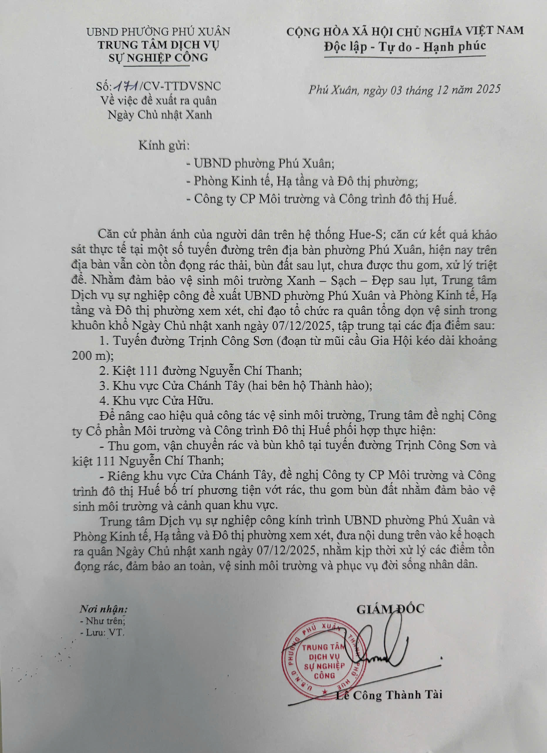 Sau khi tiếp nhận thông tin, Trung tâm Dịch vụ sự nghiệp công phường Phú Xuân đã kiểm tra, rà soát và ghi nhận thực trạng như phản ánh. Để đảm bảo vệ sinh môi trường, mỹ quan cảnh quan và dòng chảy khu vực, Trung tâm đã có văn bản gửi UBND phường Phú Xuân; Phòng Kinh tế, Hạ tầng và Đô thị phường; Công ty CP Môi trường và Công trình đô thị Huế về việc triển khai ra quân "Ngày Chủ nhật xanh" để thu gom rác thải tại khu vực này trong thời gian sớm nhất.