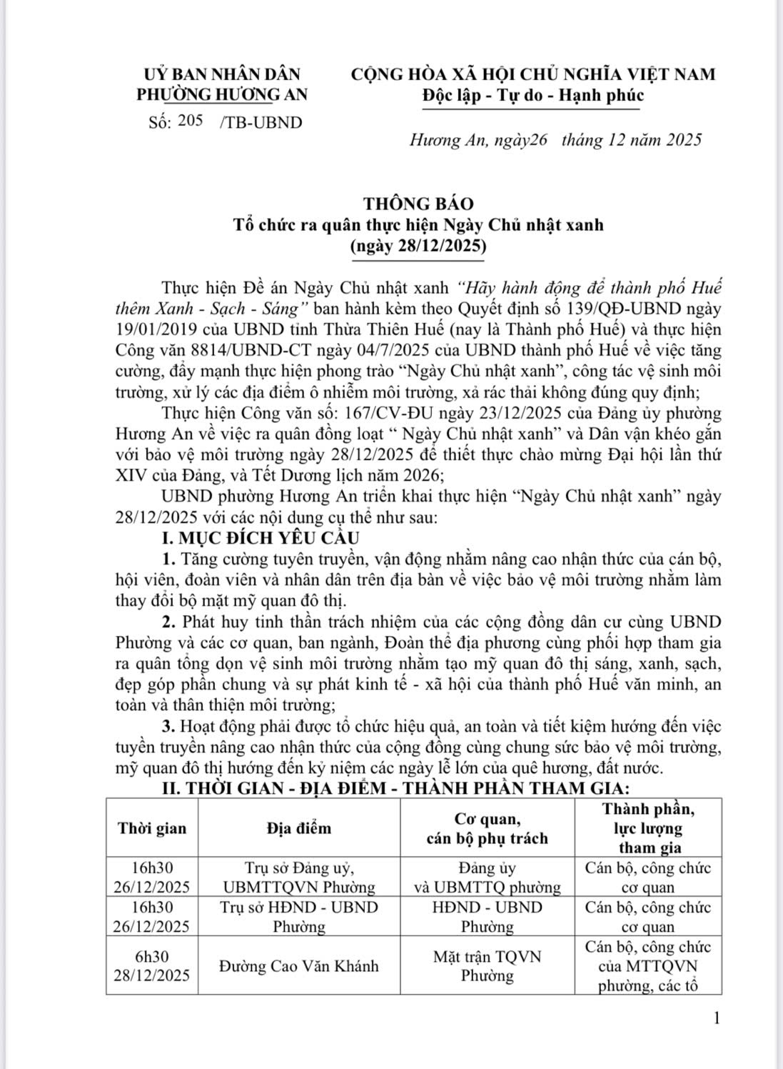 Hiện nay, UBND phường đã ban hành Thông báo số 205/TB-UBND ngày 26/12/2025 V/v Tổ chức ra quân thực hiện ngày chủ nhật xanh (ngày 28/12/2025) để các đơn vị tổ chức thực hiện. Quá trình triển khai Tổ dân phố 13 An Hòa đã phối hợp Công ty Cổ phần Môi trường và Công trình đô thị Huế tổng dọn và thu gom khối lượng rác thải tại mương thoát nước tại số nhà 18 Lý Nam Đế, đảm bảo vệ sinh môi trường và cảnh quan xung quanh khu vực.