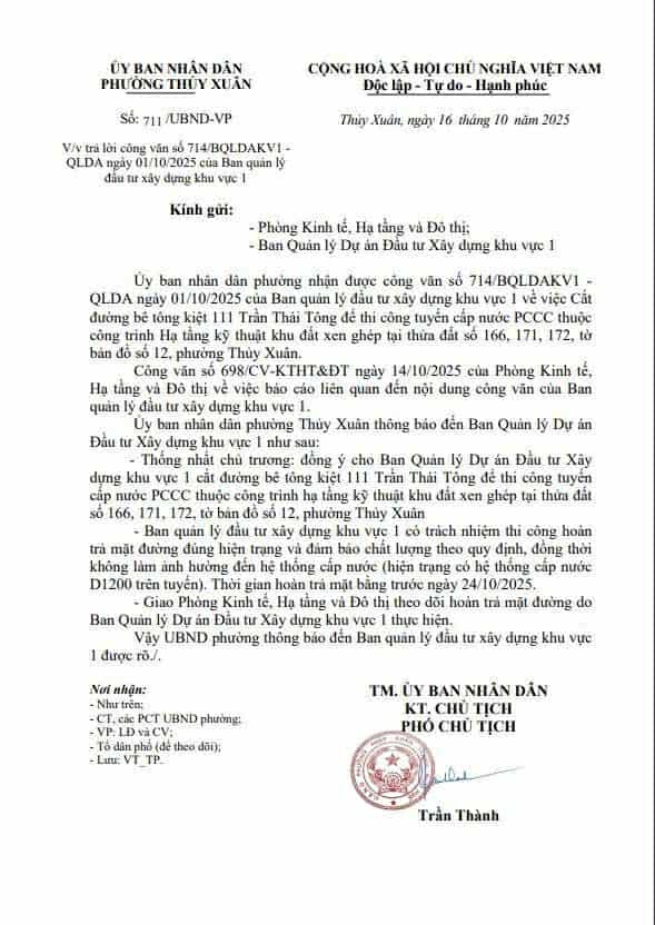 Theo Công Văn số 711/BQLDAKV1 thì kiệt 111 Trần Thái Tông, phường Thuỷ Xuân thi công tuyến cấp nước PCCC sẽ hoàn trả mặt bằng trước 24/10/2025. Xong có lẽ do thi công chậm nên BQL mới thi công rơi vào tầm ngày 11/12 tháng 11 và sau đó thì hoàn thành nhưng lại không trả mặt bằng kiệt như cũ.