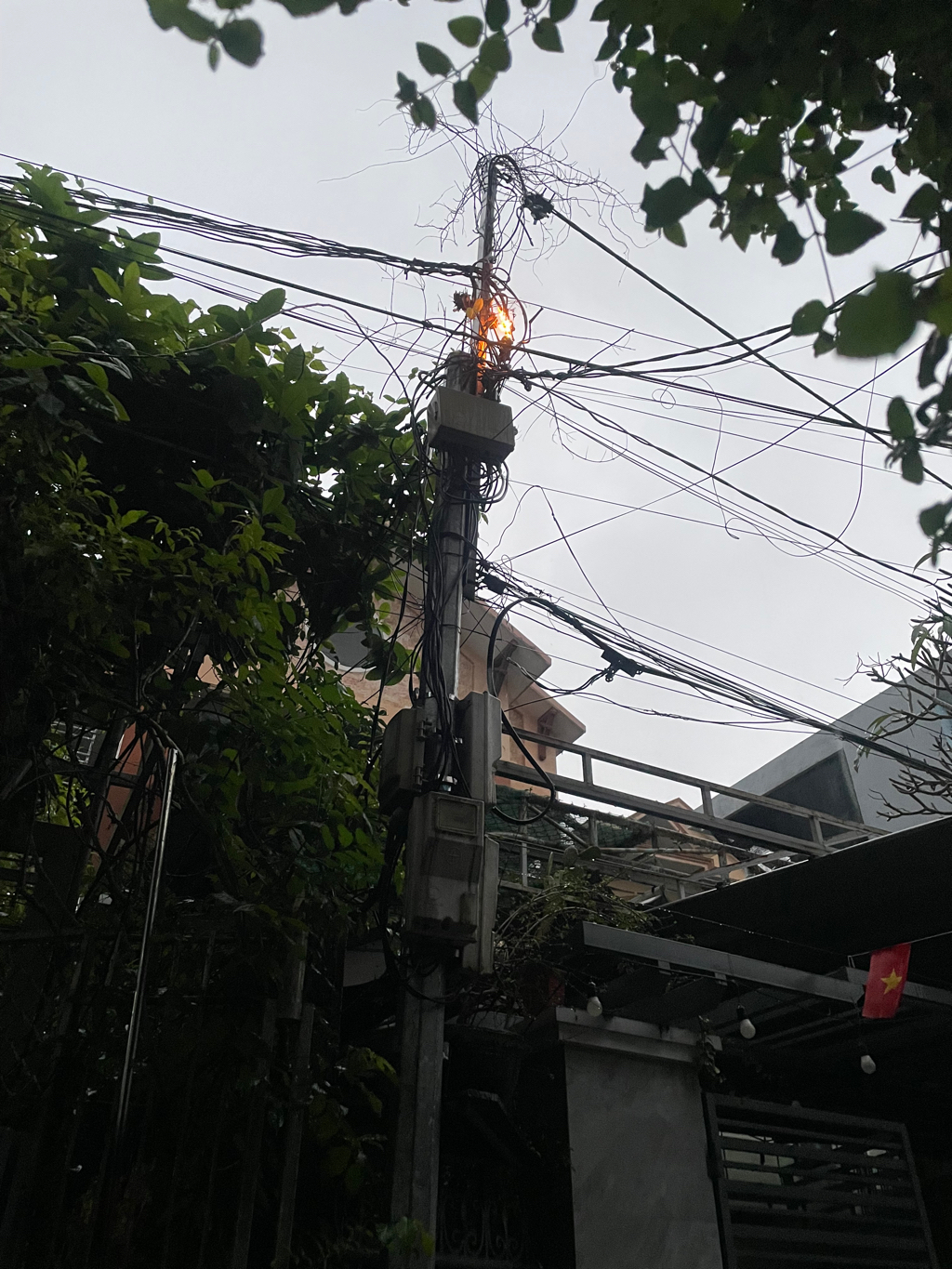 Cột điện tại số 2 kiệt 24 đường An Dương Vương bị chập cháy ngày 5/11/2025, bà con đã báo tổng đài Điện lực nhưng vẫn chưa thấy giải quyết. Hôm nay 6/11/2025 lại chập cháy lại, trời mưa gây nguy hiểm cho người đi lại. Hình ảnh ghi lại ngày 05/11/2025.