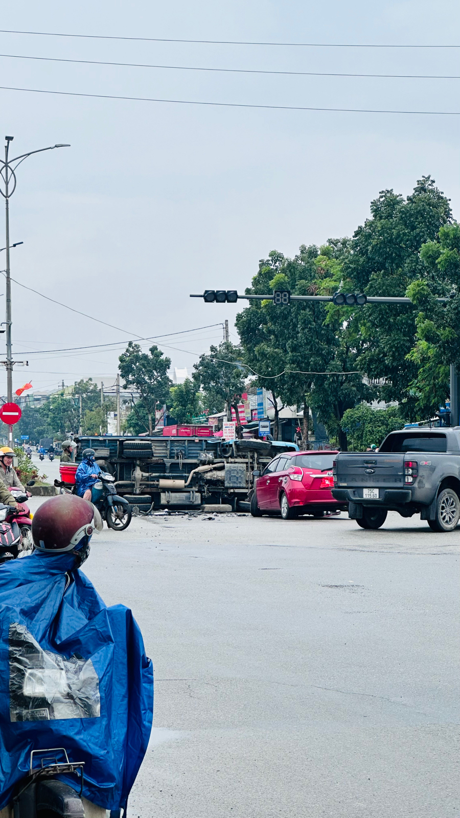 Đoạn đường ngã tư gần nhà hàng Duyên Anh, đường Võ Văn Kiệt cần bật đèn tín hiệu đèn đỏ suốt 24h vì giờ sáng dân đi buôn nhiều xe tải chạy nhiều dễ gây ra tai nạn, đây là hình ảnh mới xảy ra tai nạn hai xe ô tô