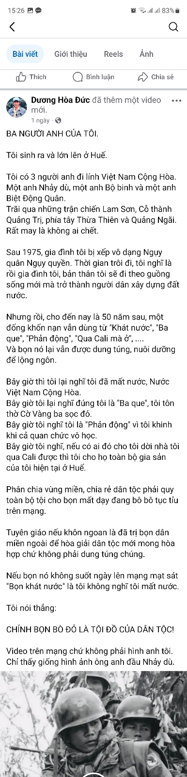 Sau khi tiếp nhận phản ánh của Ông/Bà về việc tài khoản Facebook “Dương Hòa Đức” (ID: 61578329934505) đăng tải bài viết có nội dung gây chia rẽ dân tộc, kỳ thị vùng miền và xúc phạm lịch sử, phủ nhận thành tựu cách mạng, Phòng An ninh mạng và phòng, chống tội phạm sử dụng công nghệ cao đã tiến hành thu thập thông tin, kiểm tra, xác minh.