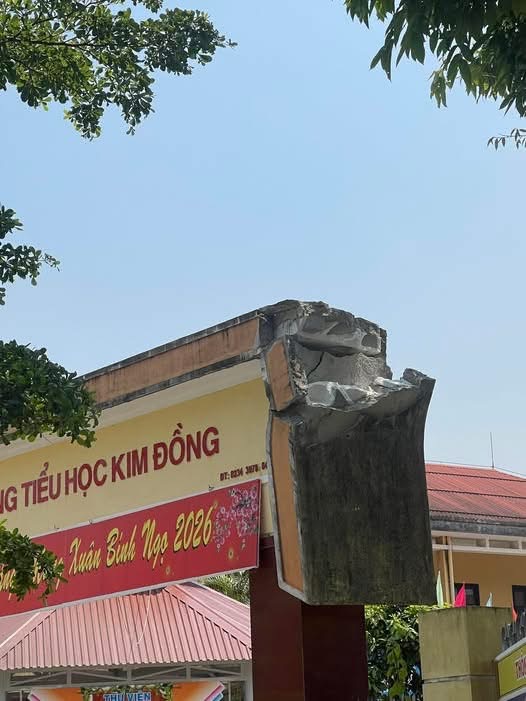 Để đảm bảo an toàn cho học sinh, giáo viên nhà trường, đề nghị kiểm tra và xử lý Cổng trường Tiểu học Kim Đồng, xã A Lưới 2, thành phố Huế khối bê tông trên cổng bị gãy, sập.