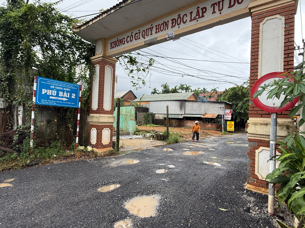 Đoạn đường ngay cổng chào xuất hiện rất nhiều ổ gà, ổ vịt. Hình ảnh đây là đoạn đường đã được sửa chữa tạm, nhưng chỉ mới vài ngày thì lại xuất hiện nhiều hố nước to. E rằng 1 tuần nữa thì nó lại trở về như tình trạng lúc chưa được xử lý.