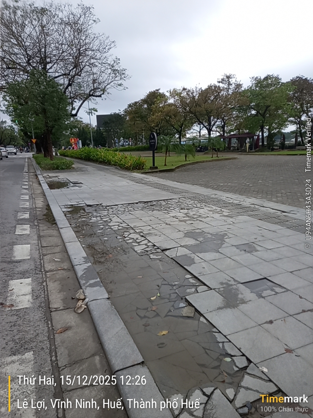 Gạch vỉa hè ở số 11 Lê Lợi, phường Thuận Hóa bị hư hỏng. Trước đó đã phản ánh và trả lời tháng 11 sẽ sửa chữa nhưng đến nay đã giữa tháng 12 tình trạng hư hỏng vẫn giữ nguyên gây mất mỹ quan đô thị của thành phố Huế trực thuộc trung ương. Kính mong cơ quan chức năng làm đúng trách nhiệm nhanh chóng xử lý. Xin cảm ơn.