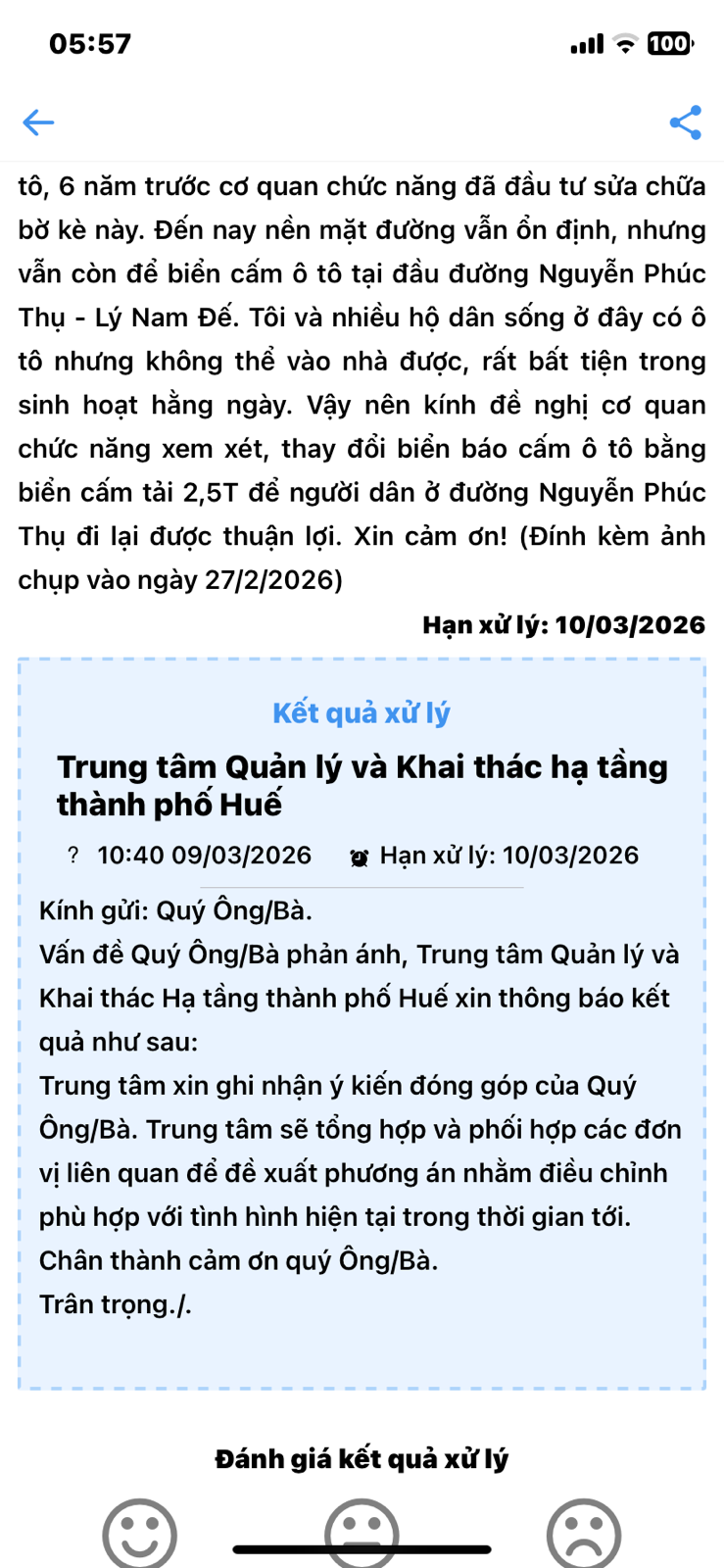 Phản ánh lần 2: Kính gửi cơ quan chức năng. Tôi và nhiều hộ dân sống tại đường Nguyễn Phúc Thụ xin có ý kiến như sau: tại bờ kè đường Nguyễn Phúc Thụ trước đây từng bị sạt lở nên cơ quan chức năng đã cắm biển báo cấm ô tô để đảm bảo an toàn. 6 năm trước đoạn bờ kè này đã được nâng cấp, sửa chữa đến nay nền mặt đường đã ổn định, không xảy ra sạt lở gì. Tuy nhiên đầu đường Nguyễn Phúc Thụ vẫn còn cắm biển cấm ô tô, rất bất tiện cho tôi và các hộ dân sống trong đây, có ô tô nhưng không thể vào nhà. Lần 1 tôi phản ánh chỉ nhận được câu trả lời chung chung. Vậy nên tôi kính mong Sở Xây dựng và UBND phường Kim Long xem xét đề xuất “đổi biển cấm ô tô thành biển cấm ô tô tải”. Xin trân trọng cảm ơn.