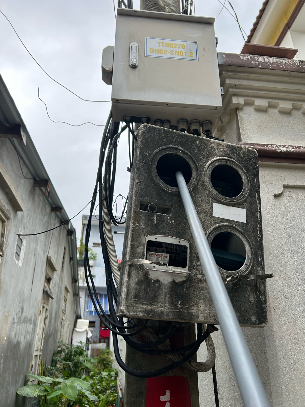 1. Hộp điện bị vỡ các tấm mica che nước, rất nguy hiểm khi nước mưa bắn vào.