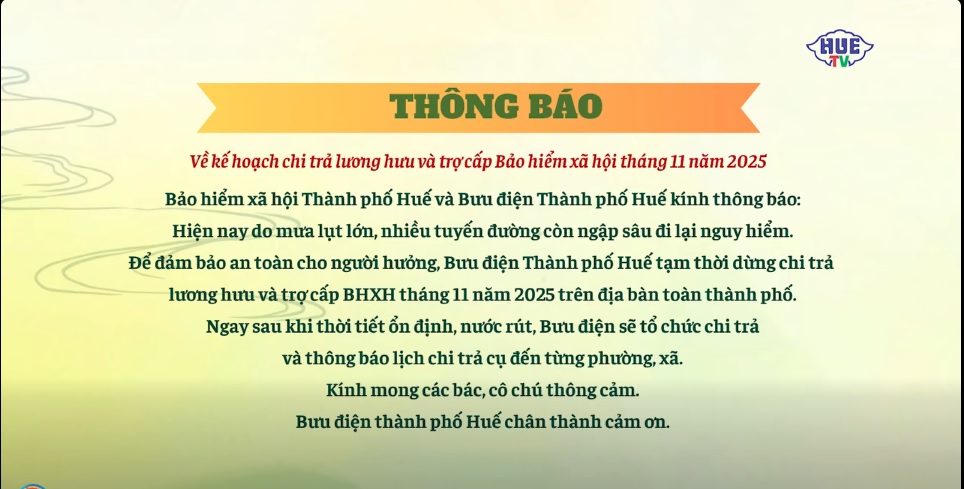 - Tuy nhiên trong tháng 11/2025 do tình hình mưa lũ lớn, nhiều tuyến đường trên địa bàn Thành Phố Huế ngập sâu, đi lại nguy hiểm nên Bưu điện Thành phố Huế đã phối hợp BHXH thành phố thông báo tạm thời dừng chi trả theo kế hoạch đã thông báo trước đây trên HueTV để đảo bảo sự an toàn người hưởng. Ngay sau khi thời tiết ổn định, nước rút, Bưu điện thành phố Huế đã tổ chức chi trả lương hưu tháng 11/2025 nhanh chóng và kịp thời.