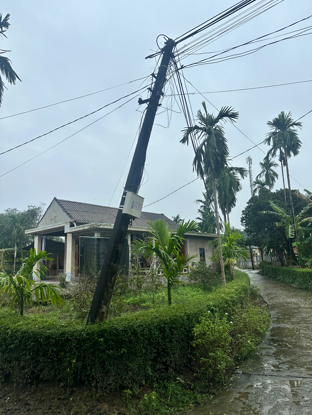 Trụ điện tại Xóm Vần,TDP Thượng An 2, Phường Phong Thái. Sắp gãy, dây điện chằng chịt. Gây mất an toàn điện. Kính đề nghị cơ quan liên quan xử lý sớm vì mùa mưa dễ rò rỉ điện.
