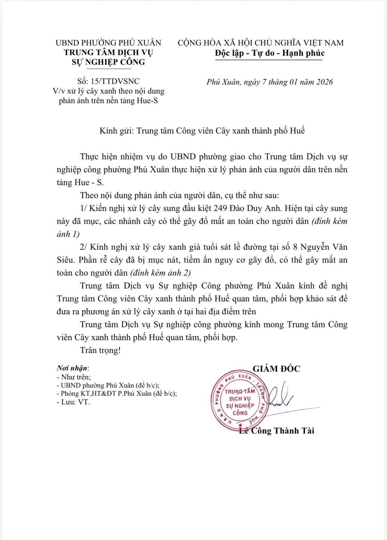 Đồng thời, Trung tâm đã có văn bản gửi Trung tâm Công viên Cây xanh thành phố Huế để phối hợp khảo sát thực tế tại vị trí phản ánh. Trên cơ sở kết quả kiểm tra, các đơn vị liên quan sẽ tiến hành tổng hợp, đánh giá mức độ nguy hiểm và đề xuất phương án xử lý phù hợp, nhằm đảm bảo an toàn cho người dân trong khu vực.