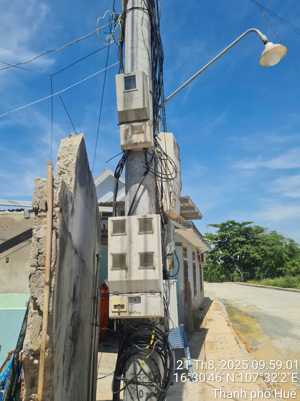 Hình ảnh chụp ngày 20/08/2025 tại trụ điện ở xóm Trường, Tổ dân phố Giáp Tây, Phường Kim Trà. Sau khi dời trụ điện cũ sang trụ điện mới gần 2 tháng thì các hộp bảo quản đồng hồ điện bị hư hại nghiêm trọng và không được thay thể phải lấy bao ni lông trùm bên ngoài cả sợ hỏng đồng hồ bên trong và không biết tình trạng như thế này khi thời tiết mưa giông có bị rò rỉ điện gây nguy hiểm cho người đi đường hay không. Kính nhờ đơn vị chức năng xử lí. Cảm ơn.