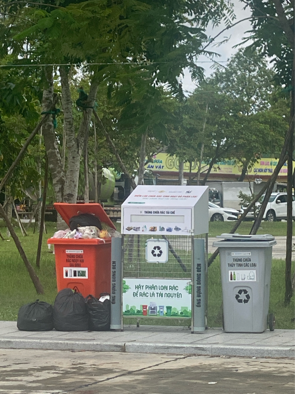 Trên đây là các thùng rác chứa rác thải tái chế tại Sân vận động Thị xã Hương Thuỷ, tuy nhiên lại xuất hiện rác thải sinh hoạt rất lâu không được xử lí, gây ra mùi hôi khó chịu.