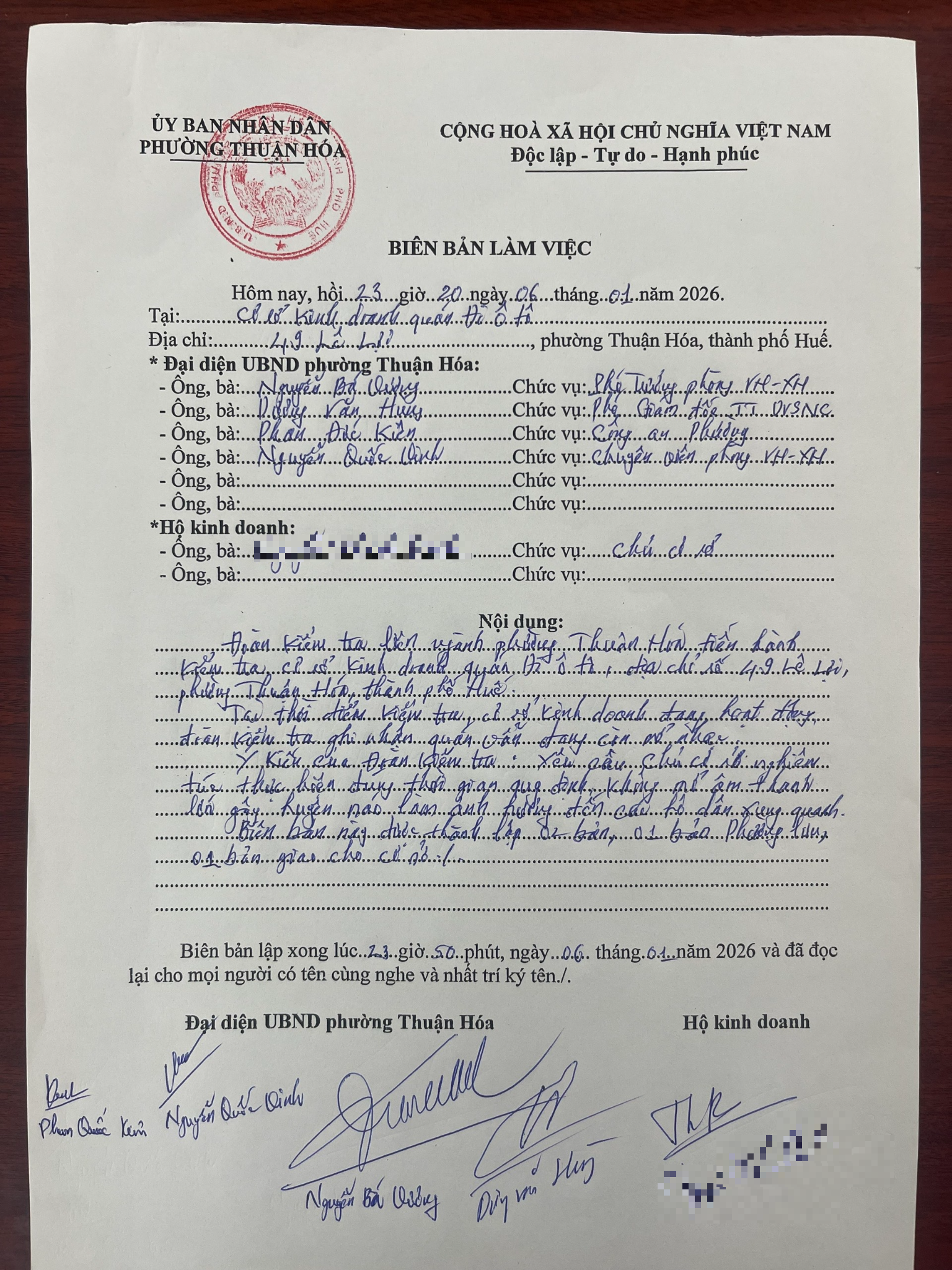Ngoài ra, Công an phường Thuận Hoá tham gia cùng Đoàn kiểm tra của UBND phường Thuận Thoá tiến hành làm việc với Quán Bar Đi Ô Tô, tại buổi làm việc Quán Bar Đi Ô Tô ghi nhận và hứa khắc phục để không ảnh hưởng đến xung quanh.
