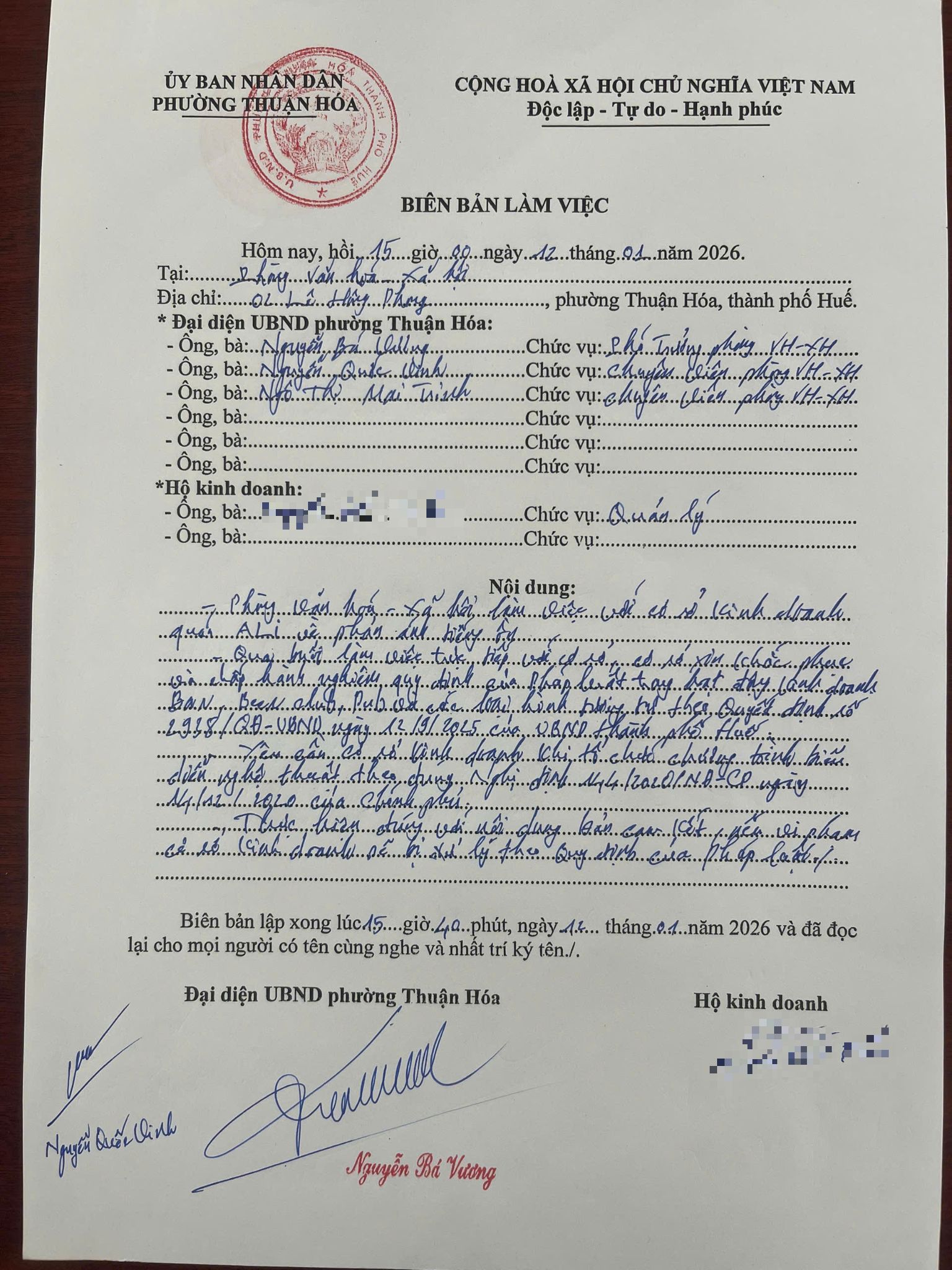 UBND phường Thuận Hóa đã chỉ đạo Phòng Văn hó – Xã hội phường kiểm tra làm việc với quán A Li số 78 nguyễn Huệ. Tại buổi làm việc chủ quán A Li hứa khắc phục và không để ảnh hướng xung quanh. (Đính kèm biên bản làm việc)