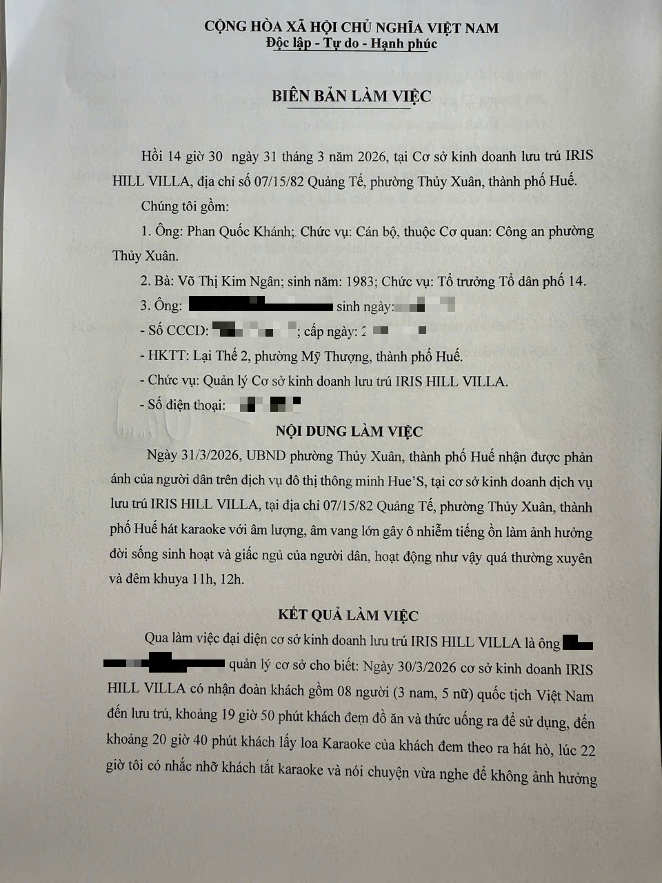 UBND phường Thủy Xuân đã chỉ đạo Công an phường phối hợp với các bên liên quan tiến hành kiểm tra, xác minh nội dung phản ánh. Qua kiểm tra thực tế, Công an phường Thủy Xuân đã phối hợp với Tổ trưởng Tổ dân phố 14 lập biên bản làm việc đối với ông Đ.C.Q.P – người quản lý cơ sở kinh doanh IRIS HILL VILLA.